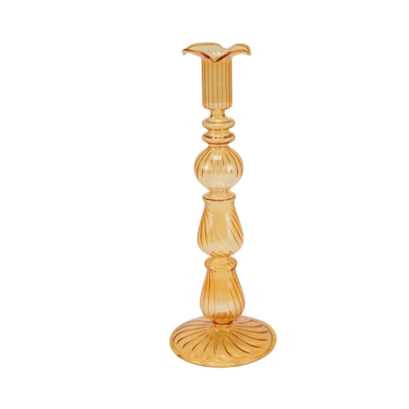 The Chandelier from Henriette's Versailles collection combines classic elegance and refined design, transforming candlelight into a striking decorative element. Crafted from high-quality glass, its warm, luminous amber color adds depth and character to any space. Standing 26.5 cm tall, this slender candleholder is perfect for showcasing stem candles or as a standalone decorative object on tables, shelves, or consoles. The Versailles collection embodies Henriette's philosophy of combining fine materials, timeless style, and functionality, offering furnishing accessories that enhance any space with elegance and harmony.
