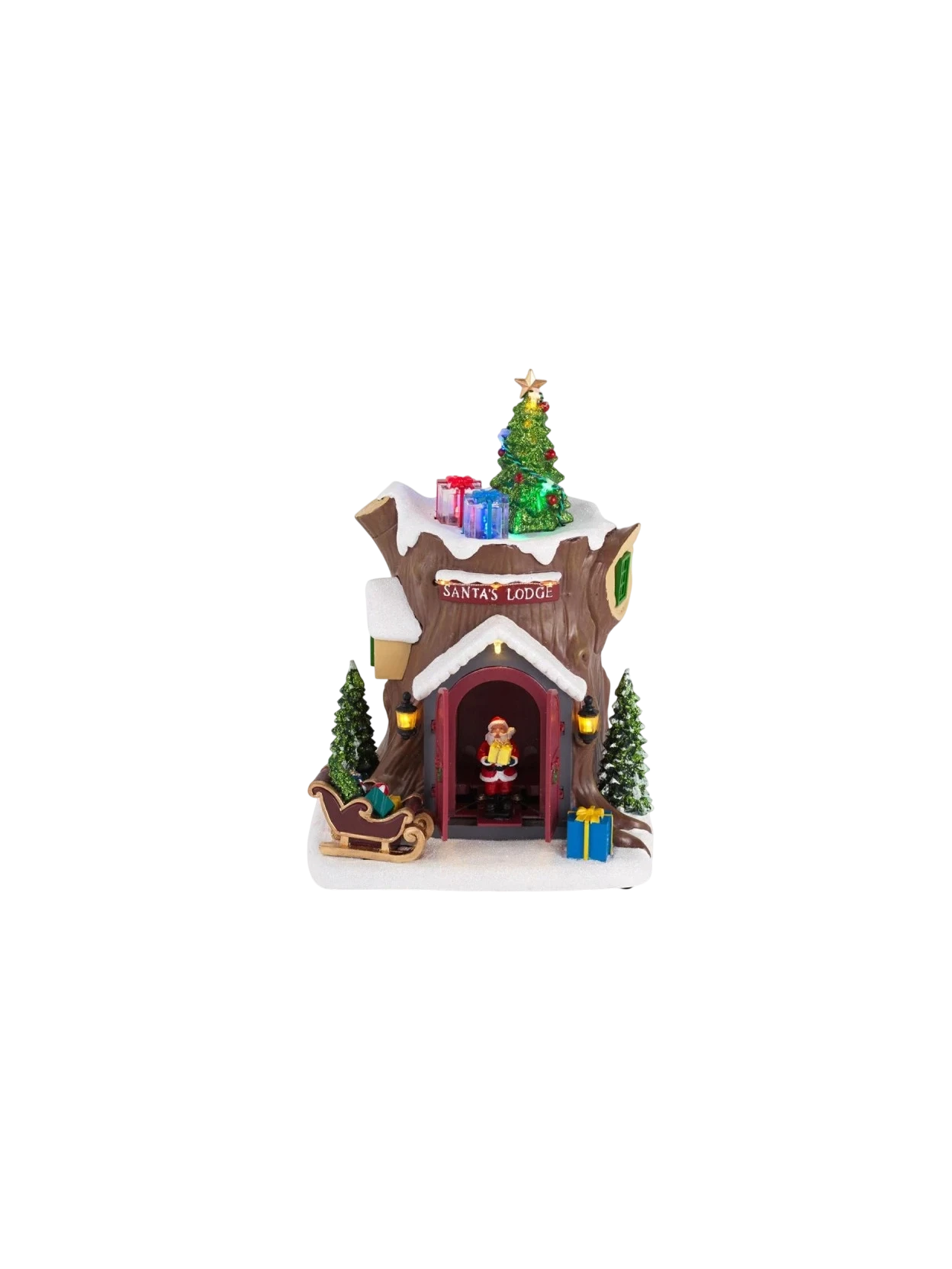 Henriette's resin Christmas tree village, with lights, music, and movement. Original and fun, Santa Claus pops out of the charming little door, transforming any room into a magical and playful Christmas atmosphere.