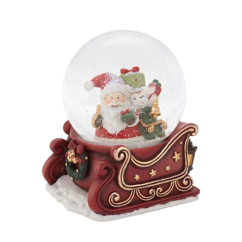 Experience the magic of Christmas Eve with the Sleigh Musical Globe from the Henriette Prestige Collection. Inside, a sleigh glides through the snow amidst twinkling lights, while a gentle melody fills the room with harmony and wonder. Every detail, sculpted and hand-painted, evokes the joy and anticipation of Christmas Eve. Measuring 10.5 × 10 × 14.5 cm, this globe becomes a small theater of emotions, ideal for adorning shelves, consoles, or corners dedicated to the magic of the holidays. Henriette transforms Christmas tradition into a living and poetic scene that captivates both adults and children.