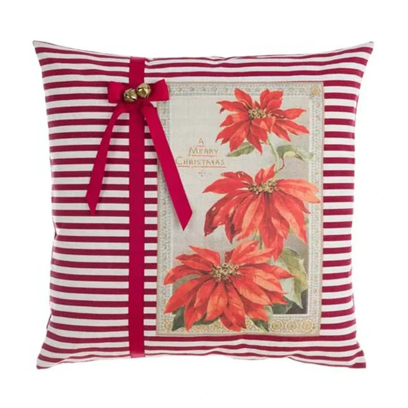 Make your home even more welcoming and festive with the Jingle Bells pillow by Blanc Mariclò. Made of cotton and decorated with a striped and poinsettia print, it's the perfect addition to create a warm and magical atmosphere during the holidays. The red bow with two bells adds a cheerful and refined touch, evoking the sound and spirit of Christmas. Its 45x45 cm dimensions make it ideal for sofas, armchairs, or beds, easily matching any decor style, from classic to shabby chic. With the Jingle Bells pillow by Blanc Mariclò, every corner of the home is adorned with elegance and tradition, bringing smiles and warmth to the whole family.