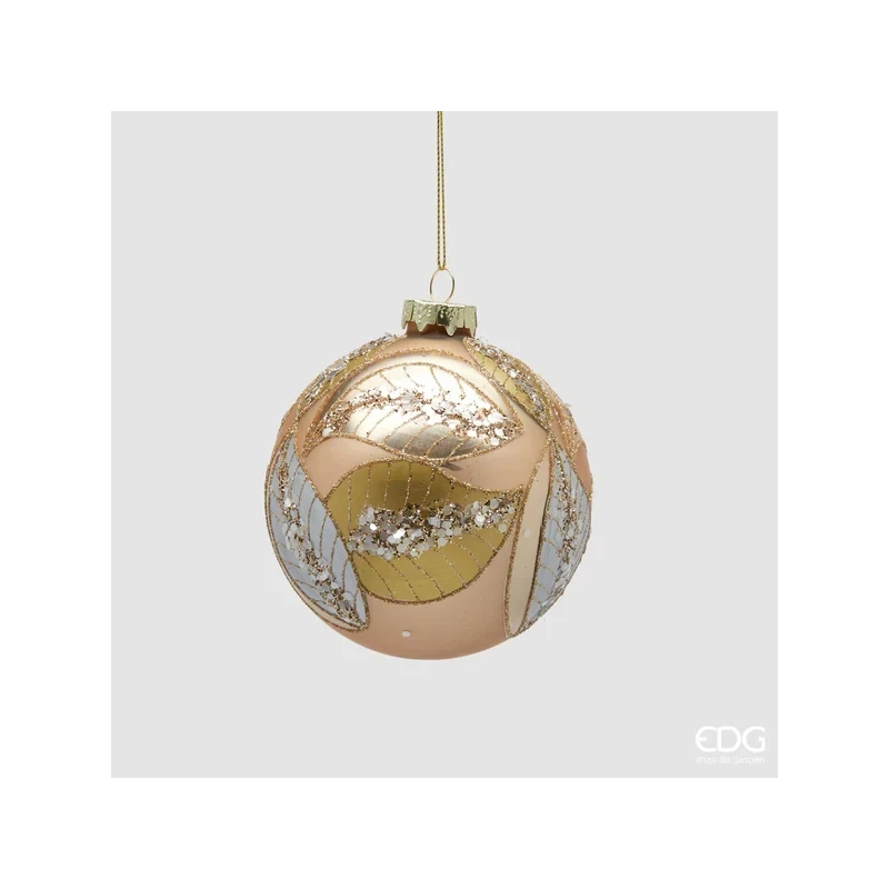 The Green Gold Leaves glass Christmas bauble combines elegance and sophistication. Available in 12 cm and 15 cm diameters, it features a sophisticated design with leaf motifs and golden highlights, ideal for enhancing trees, wreaths, and centerpieces.