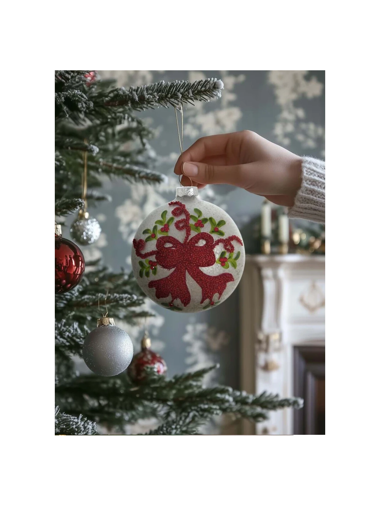 The white glass Christmas bauble from the Ornamenta Collection is a decoration that combines grace and tradition, ideal for those who wish to enrich their tree with elements of style and refinement. Measuring 12 cm in diameter, this splendid sphere features an elegant central bow decorated with precious red appliques that create a striking contrast of colors and reflections. Crafted from glass, it emits a soft, warm light, creating a welcoming and festive atmosphere. Perfect for lovers of classic yet sophisticated Christmas decorations, it pairs harmoniously with other ornaments from the same collection, enhancing every detail of your tree. A Blanc MariClò creation that transforms every decoration into a gesture of timeless elegance and style.