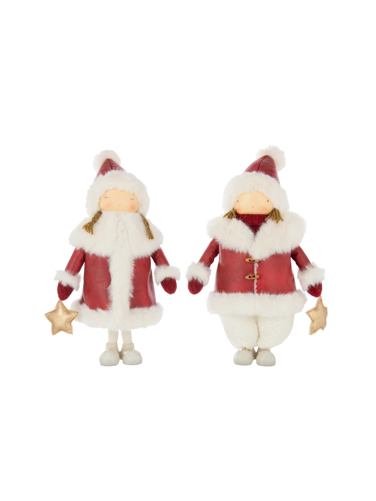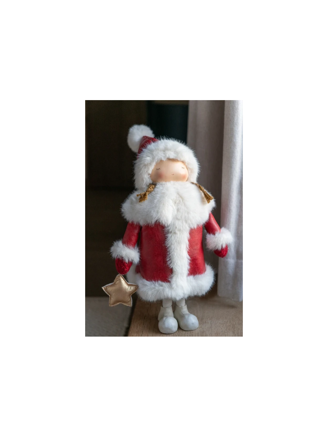 This decoration depicting a little girl holding a star in her hand brings Christmas spirit to any space. The decoration is available in two sizes (21 x 11 x 31 cm and 28 x 16 x 48 cm) and two versions, with the star in the right or left hand, to suit any display. Made of durable and colorful polyester, it is perfect for placing on shelves, tables, or in any corner of the home, adding a touch of joy and sophistication to interiors during the Christmas season. This decoration combines festive details and original design, making any space warm and welcoming.