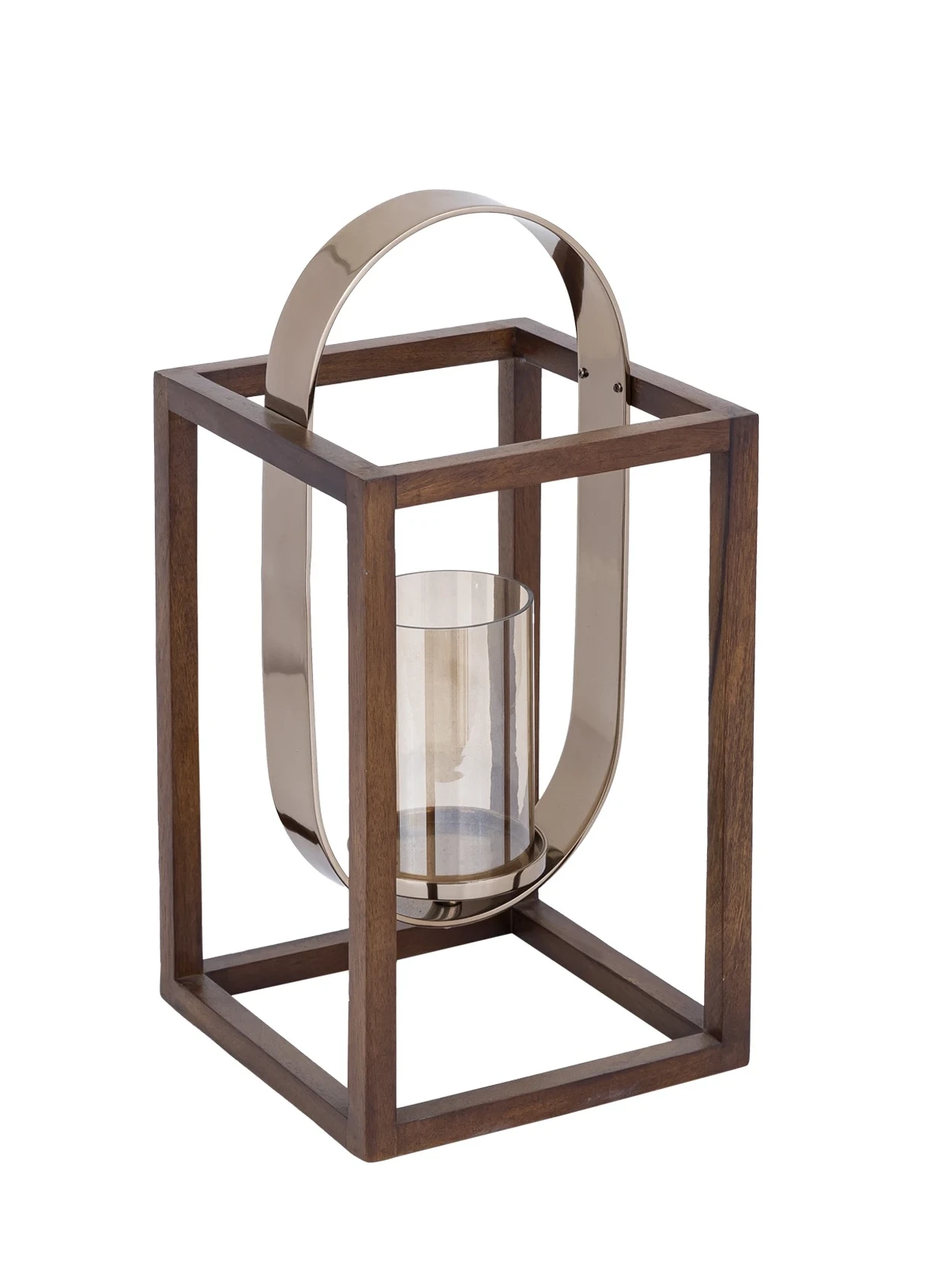 La lanterna Shirah di PTMD in marrone combina vetro, metallo e legno di mango per un design artigianale e sofisticato. Disponibile in due altezze, è perfetta per creare atmosfera in ogni ambiente.