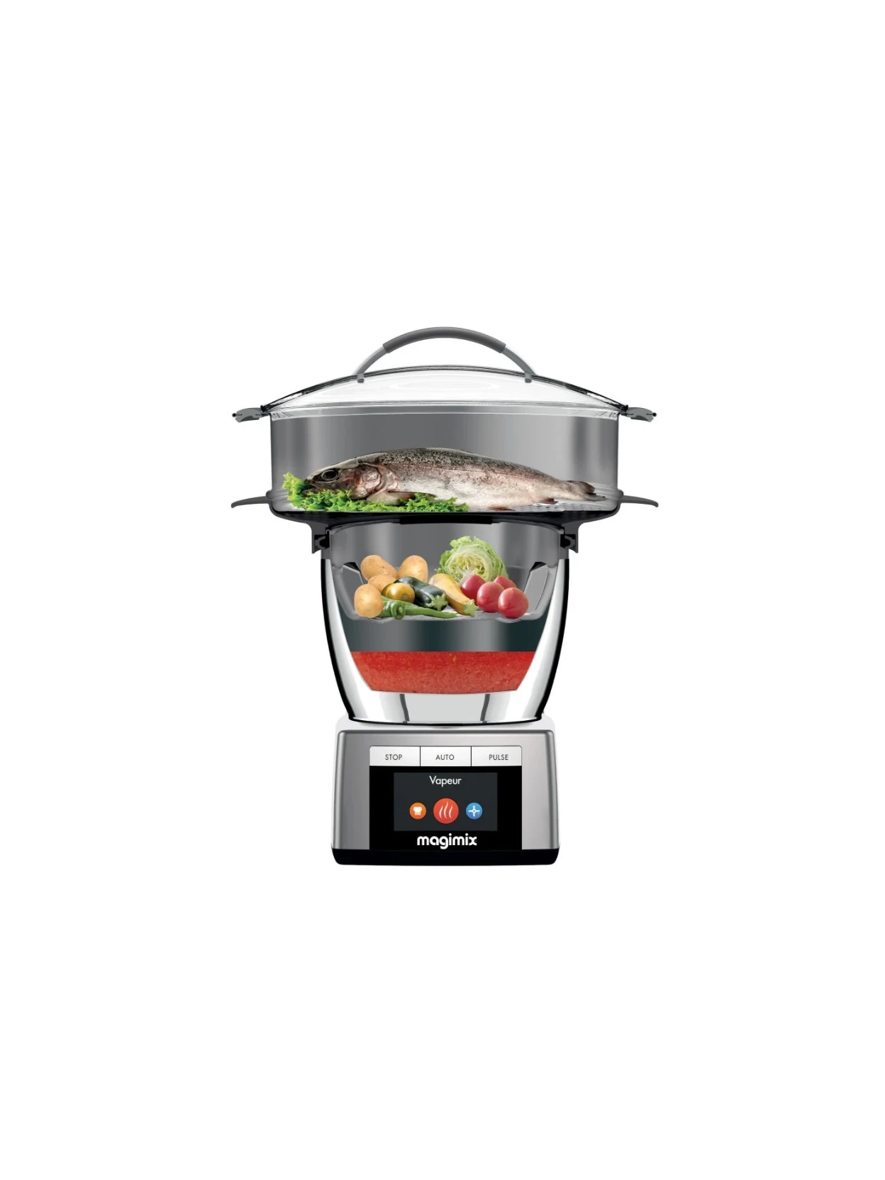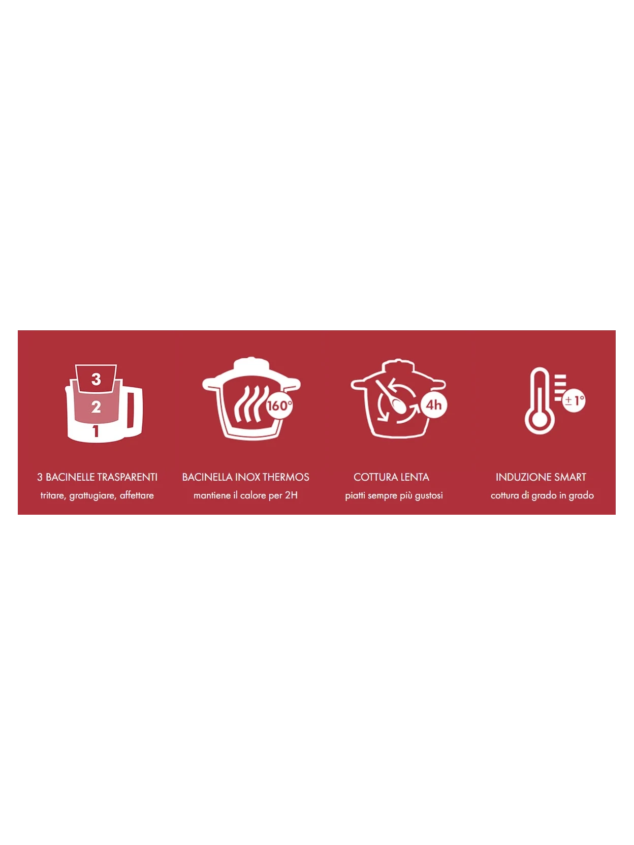 Cook Expert by Magimix is the advanced food processor that combines ultra-precise induction cooking, versatility, and ease of use. The 3.5-liter stainless steel thermal bowl maintains heat for up to two hours and works with maximum precision thanks to degree-by-degree adjustment, ideal for stews, cream soups, browning, yogurt, and steaming. The three transparent bowls—3.6 L, 2.6 L, and 1.2 L—allow for seamless slicing, grating, and chopping, ensuring fast, professional performance. The color display with automatic programs, guided recipes, and video tutorials makes every preparation intuitive, while the 1700 W power delivers impeccable results for dough, desserts, smoothies, frozen desserts, and much more. Complete with metal knives, multi-level steam baskets, a slicer/grater, scales, a recipe book, and an app with over 450 recipes, it's a complete processor that inspires creativity and simplifies everyday and gourmet cooking.