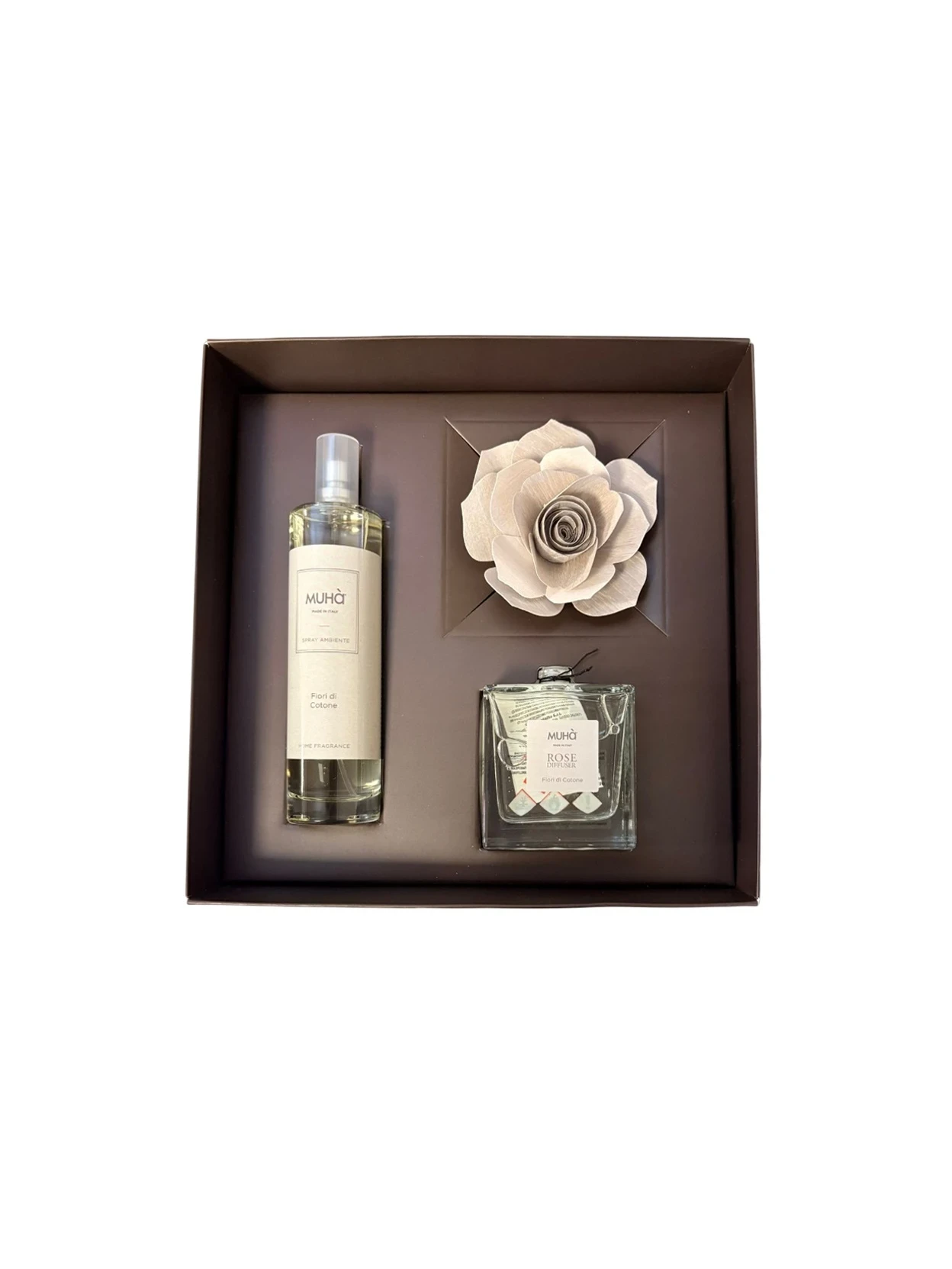 The Muhà "Rose" Gift Set embodies elegance and harmony in a carefully crafted scented set. It contains a 100 ml room diffuser with a handcrafted birch wood rose and a 100 ml room spray, both in the Cotton Flowers fragrance, a symbol of purity and comfort. The fragrance opens with fresh notes of bergamot and ozonic accents, evoking the cleanliness and lightness of laundry hanging out to dry in the sun. The floral heart notes include jasmine, lily of the valley, violet, orange blossom, ylang-ylang, and rose, creating a delicate and refined bouquet. The base notes of musk, tonka bean, amber vanilla, and sandalwood add depth and warmth, enveloping the room in a soft and relaxing embrace.