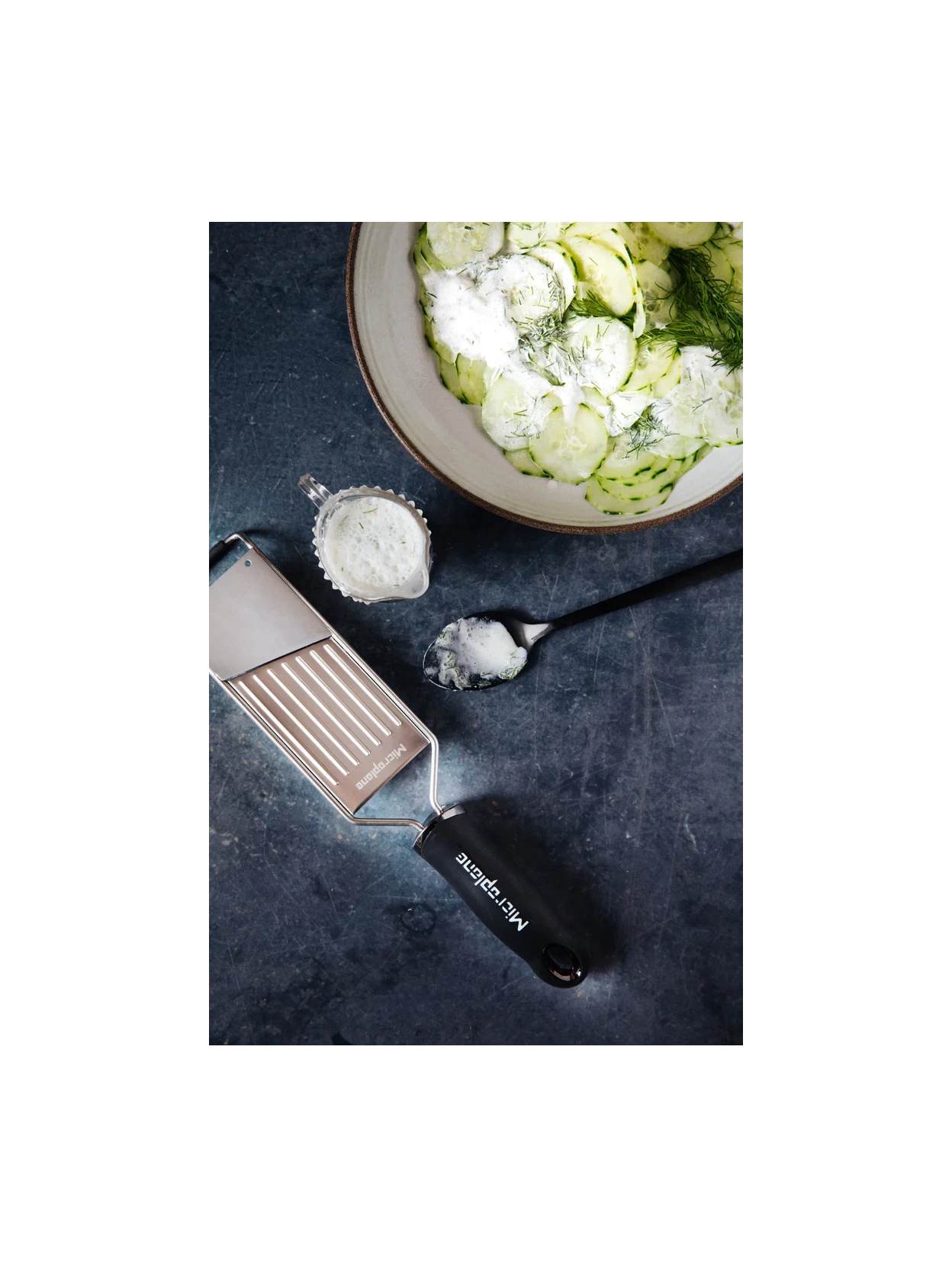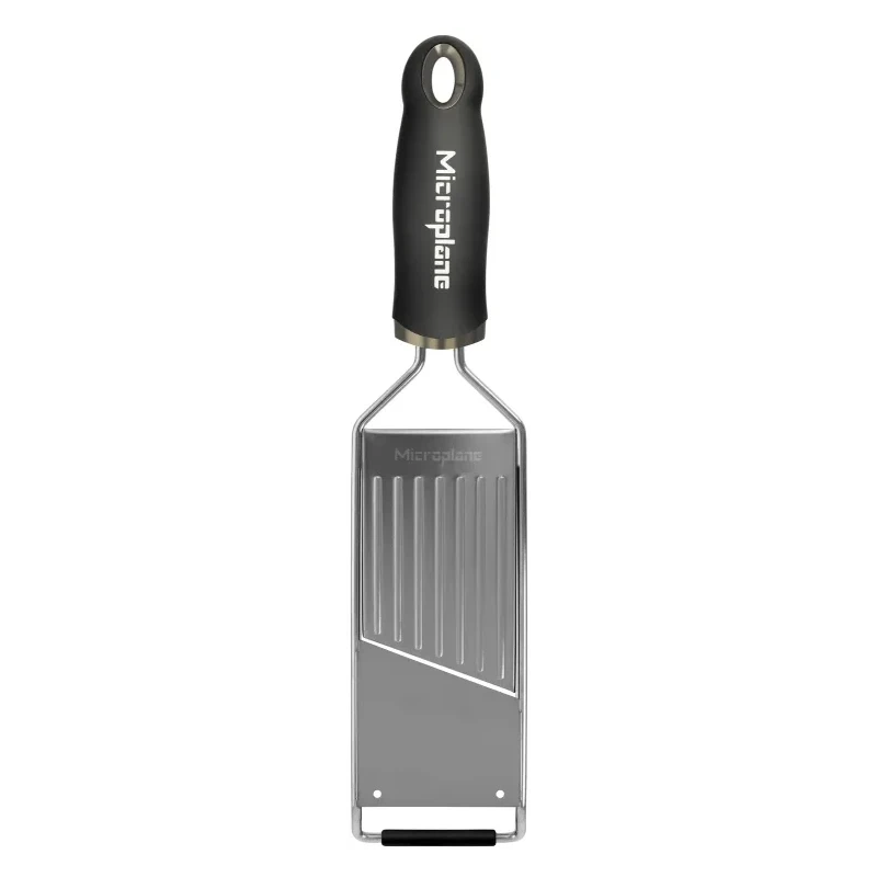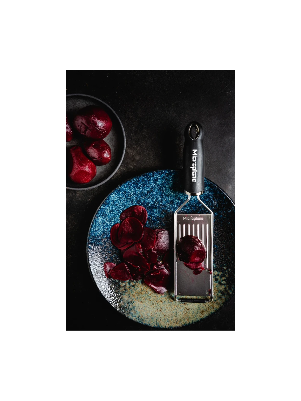 The Microplane Gourmet Mandolin in black offers precise and uniform cutting thanks to its razor-sharp stainless steel blade. It's perfect for quickly slicing cucumbers, zucchini, potatoes, onions, apples, and many other vegetables or fruits with a consistent 2 mm thickness. Compact, ergonomic, and stable, it's ideal for quick and professional preparations in the kitchen.