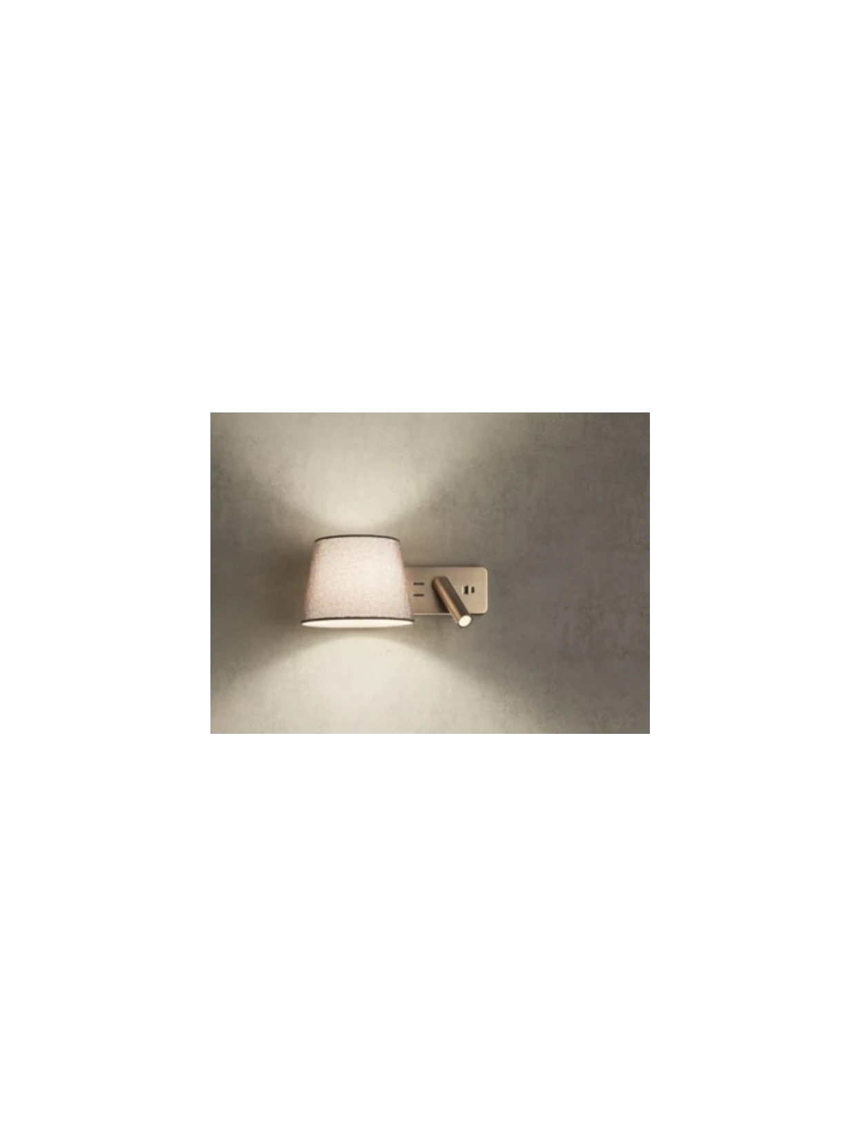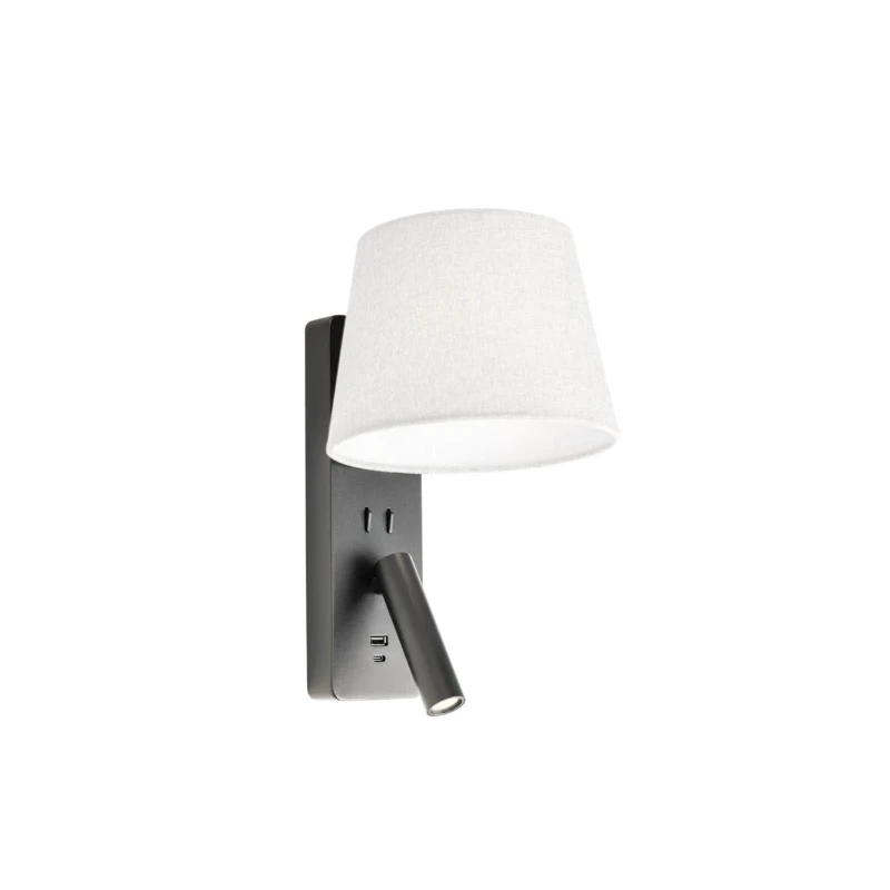 The Nemia wall lamp by Redo Group, available in a modern matte black finish, is an elegant and versatile solution designed to combine ambient lighting and reading light. The matte black painted metal and aluminum frame integrates an adjustable spotlight equipped with 3W BRIDGELUX SMD LEDs, with a selectable color temperature between 2500K and 3000K, allowing you to choose between an extra-warm and relaxing light or a brighter one for reading. The wall lamp is equipped with a 2.1A USB A + C port, ideal for conveniently charging smartphones and devices, as well as dual ON/OFF switches for separate control of the light sources. Compatible with an E27 bulb up to 15W, it can be completed with a lampshade (sold separately) for a more diffused and welcoming light.