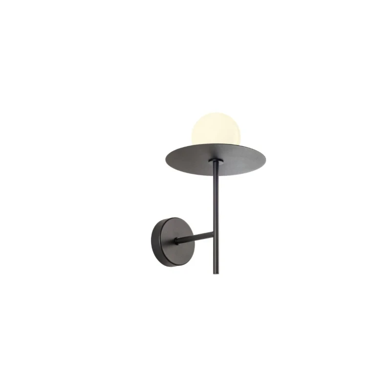 Wall lamp made of matt black metal. Opal blown glass diffuser.