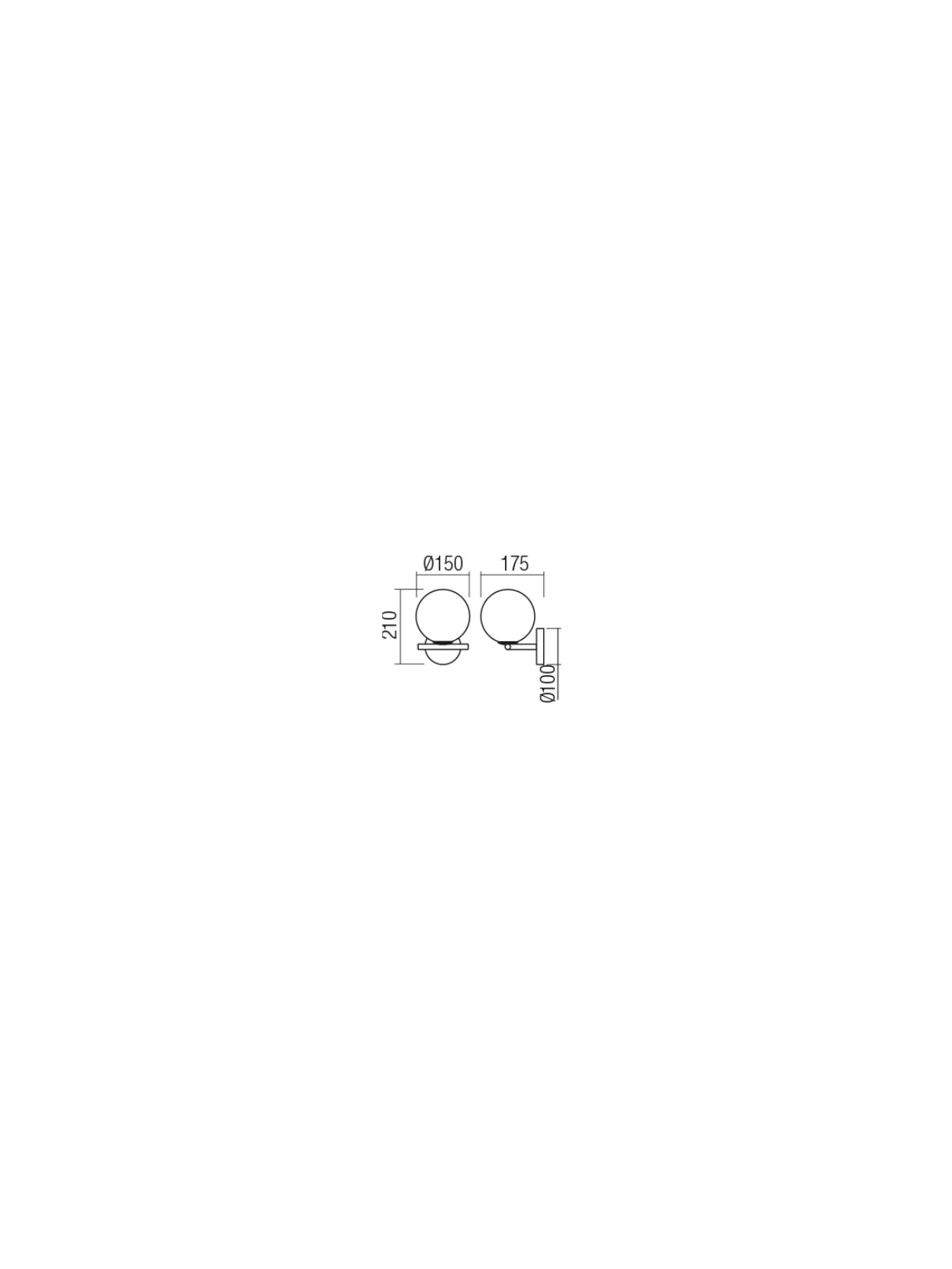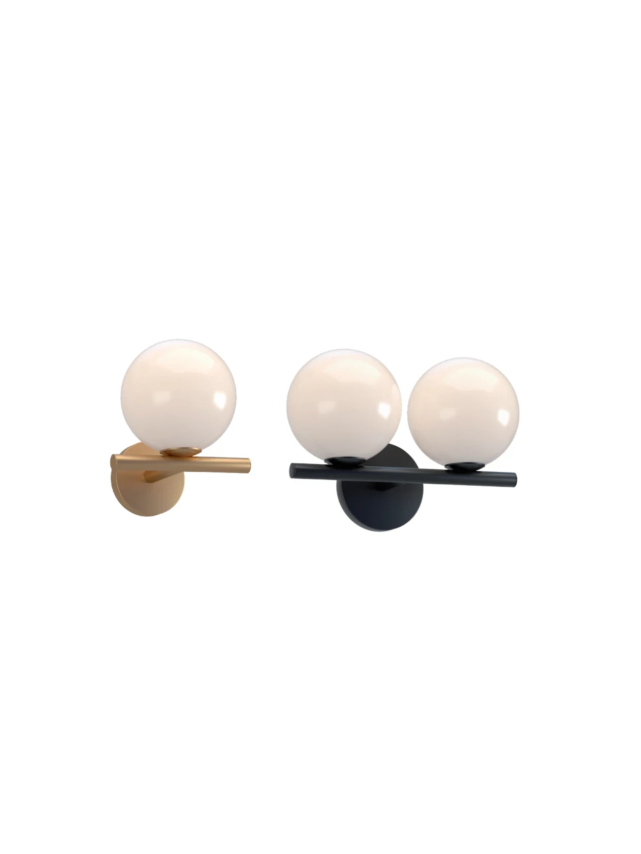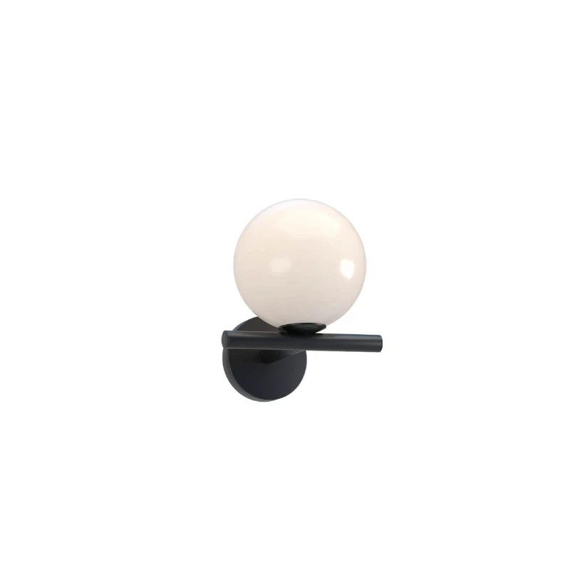 Wall lamp with metal frame in matt black finish and spherical diffuser in opal white blown glass.