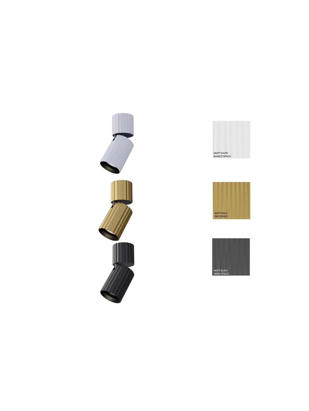 Adjustable ceiling lamp made of metal and extruded aluminum, powder coated in white, black or matt gold on the outside and matt black on the inside.