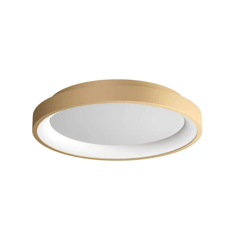 Iconic by Redo Group is a modern interior LED ceiling lamp featuring a 3-step dimmer and adjustable color temperature from warm white (3000K) to neutral white (4000K). Its metal and aluminum frame is painted matte gold, with a white opal acrylic diffuser for a soft, even light. High-efficiency SMD LEDs with a CRI of 90. Class II, IP20 – Power supply 220–240V, 50/60Hz.