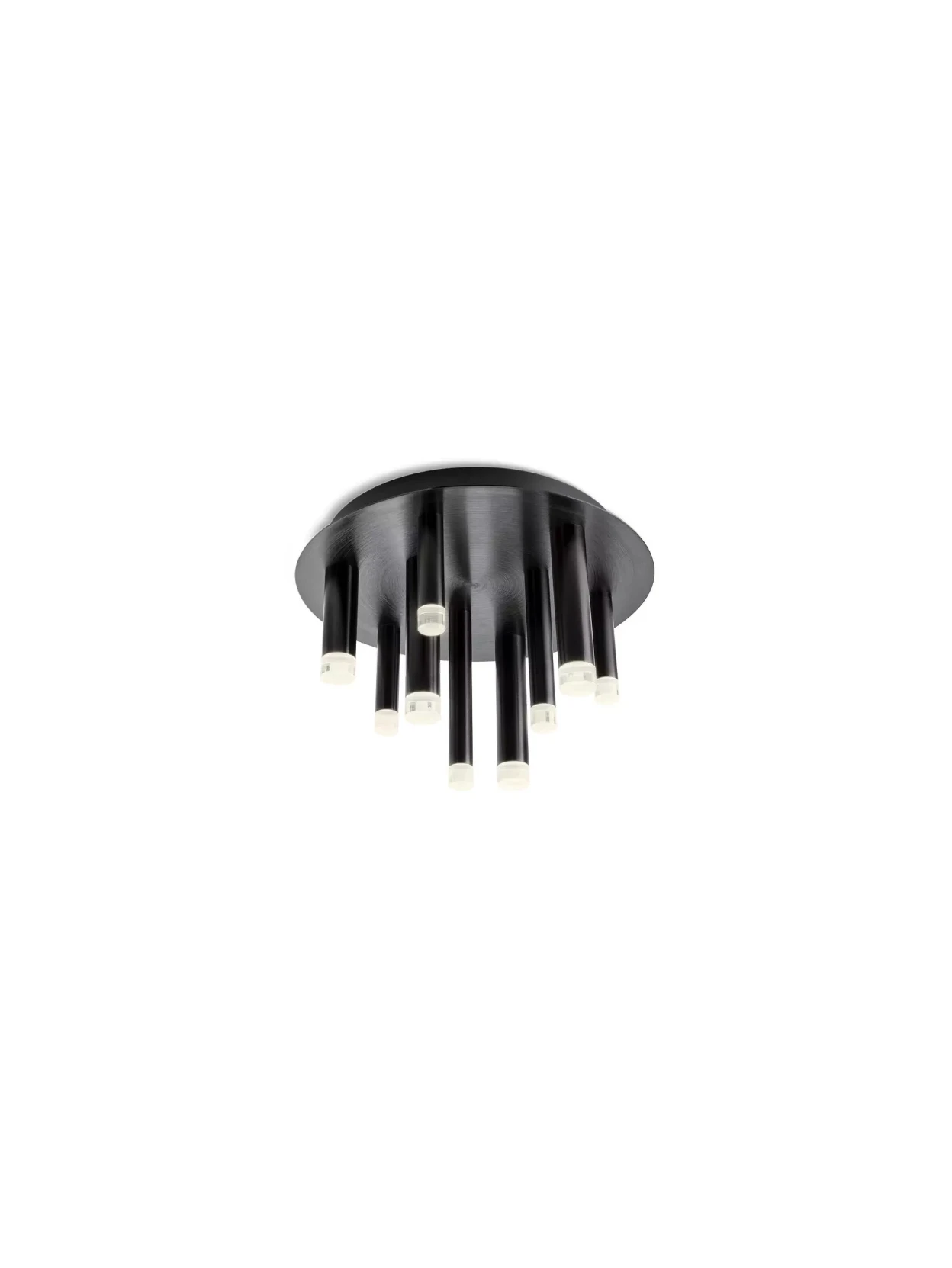 LED ceiling lamp made of metal and brushed aluminum anodized matt black and transparent acrylic diffusers.