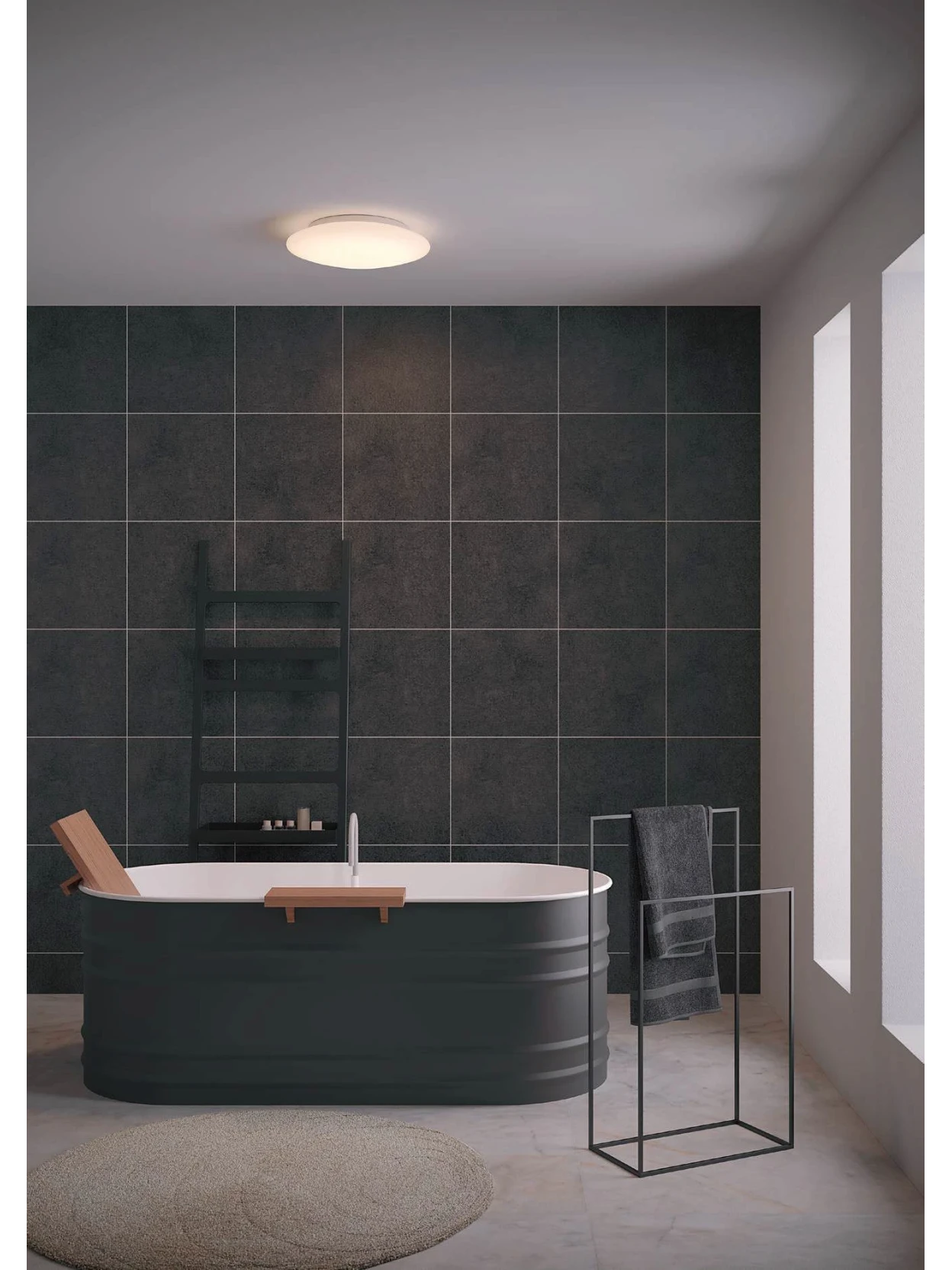 The Antiba lamp by Redo Group is an essential and refined ceiling lamp, this ceiling lamp is equipped with integrated SMD LED and effectively protects against humidity, making it ideal for environments such as bathrooms and kitchens. The white painted metal frame combines with the opal white blown glass diffuser, offering a soft and harmonious light that enhances every space with discretion and style.