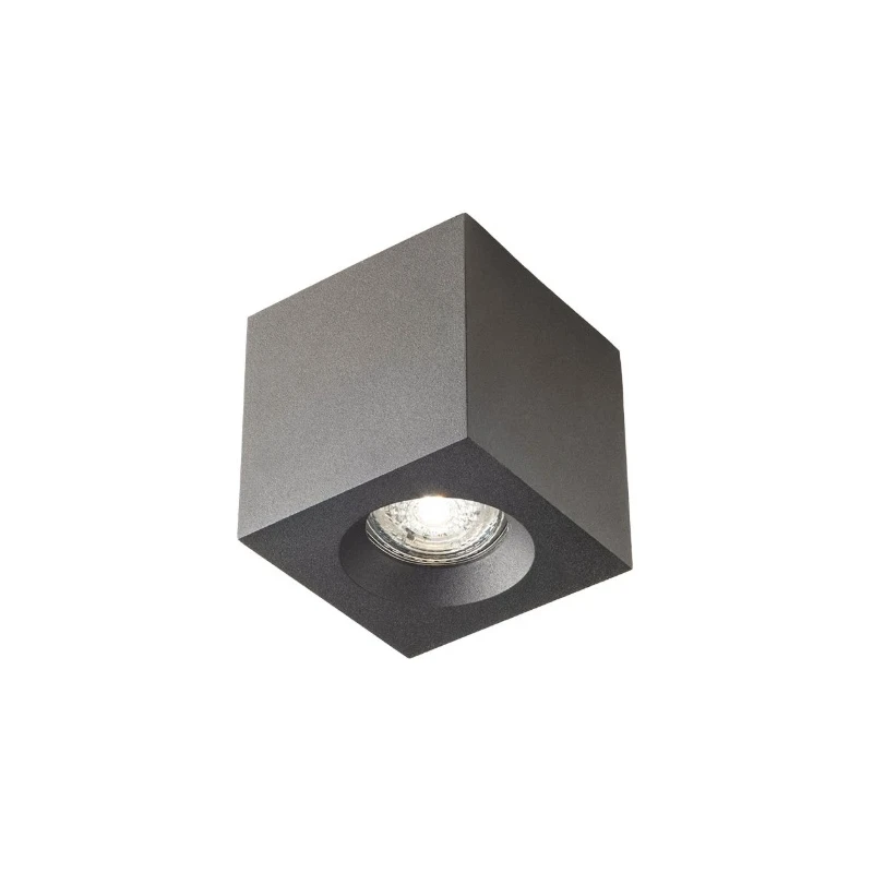 Prato by Redo Group is a compact and durable square ceiling lamp, ideal for indoor spaces, even those with high humidity, such as bathrooms or hallways. Made of die-cast aluminum with a matte black powder coating, it features a clear glass diffuser. Compatible with a GU10 bulb (max 35W), it guarantees practicality and durability. IP44 and Class II protection rating, perfect for functional and discreet lighting with a modern touch.