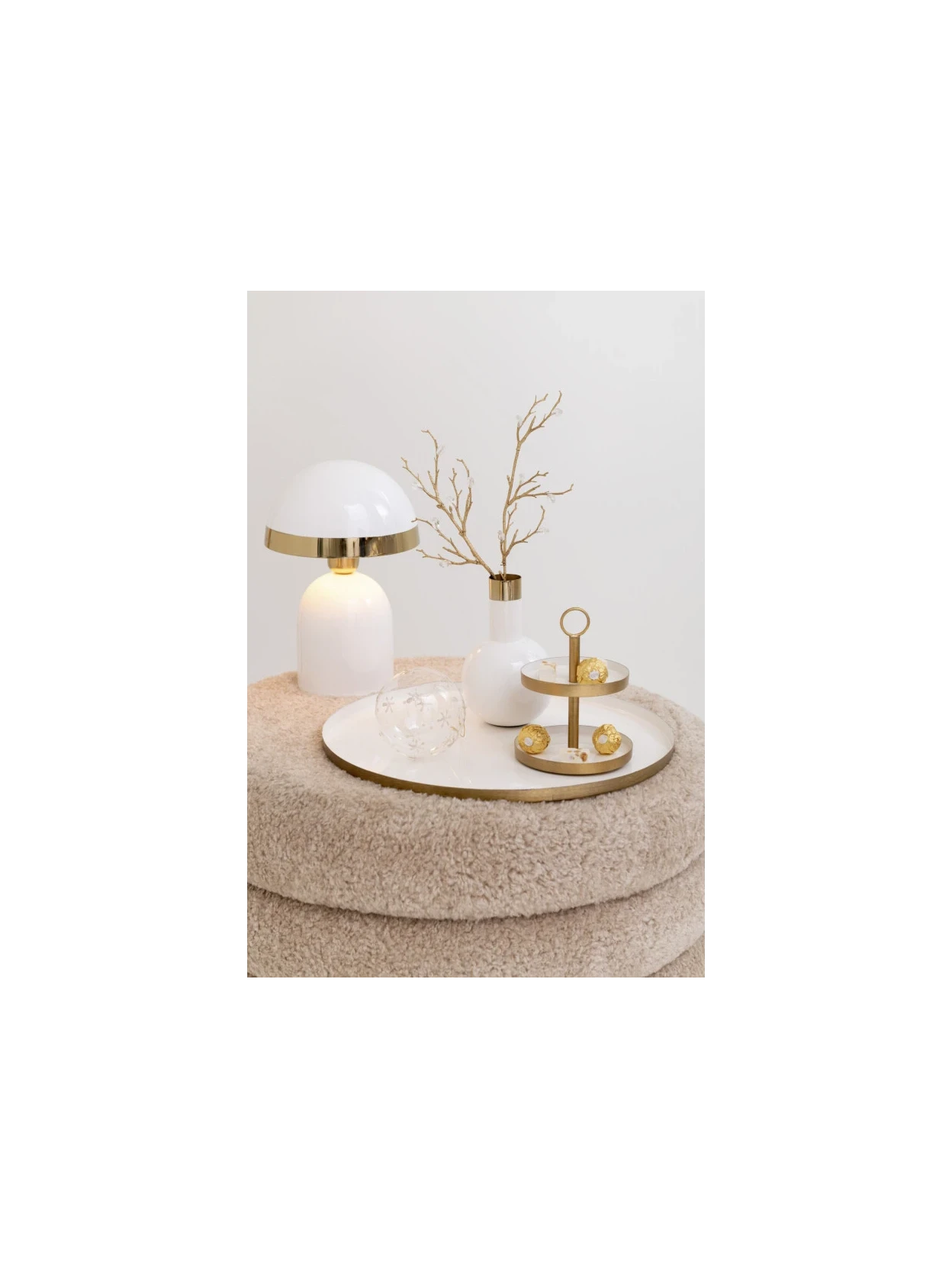 Add light and class to your spaces with this glossy white metal table lamp with a gold trim. Perfect for the living room, study, or bedroom, this lamp combines modern design and elegant details, becoming a distinctive furnishing element. Crafted from high-quality polished metal, it measures 20 x 20 x 30 cm, with an E27 bulb holder and a maximum power of 25 W. The 200 cm cable allows for flexible positioning, while the contrast between the elegant white and gold trim creates a sophisticated and luminous effect.