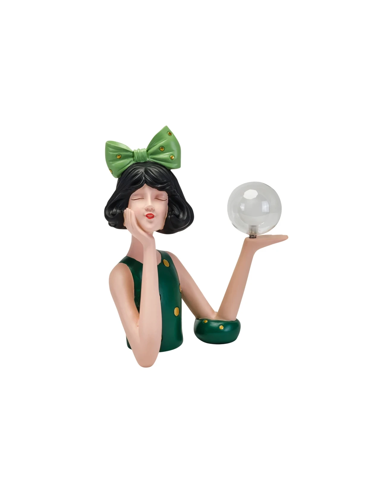 Brighten up your home with Henriette's Majorette Table Lamp, crafted from hand-painted resin with vibrant colors and unique details. The lamp depicts a raven-haired young lady dressed in green with a matching bow and holding a luminous sphere that serves as a diffuser. Measuring 28 x 31 cm, it's perfect as a decorative and functional element for the living room, bedroom, or study. Each piece in the Majorette collection combines art, design, and originality, making any space more elegant and welcoming.