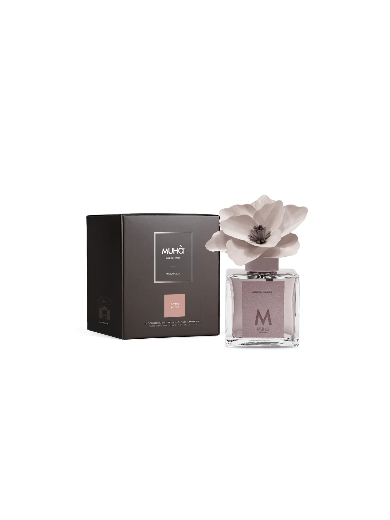 An Italian-designed room diffuser that blends aesthetics and craftsmanship. The glass bottle, embellished with a zamak neck, pairs with a handcrafted birch magnolia to diffuse intense and enveloping fragrances. Every detail is meticulously crafted, transforming spaces into true havens of sensory luxury. The faux leather label adds a touch of sustainable elegance, blending style and sophistication in perfect harmony.