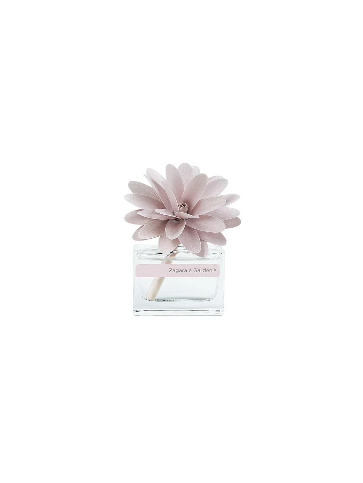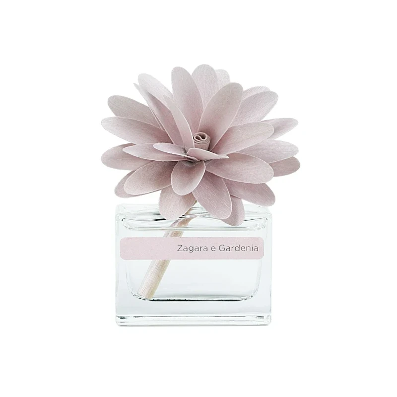 An elegant glass bottle holds a unique fragrance, with a handcrafted birch wood flower that releases delicate notes into the air. A refined object that combines craftsmanship and harmony, transforming any space into a space of light, beauty, and serenity.