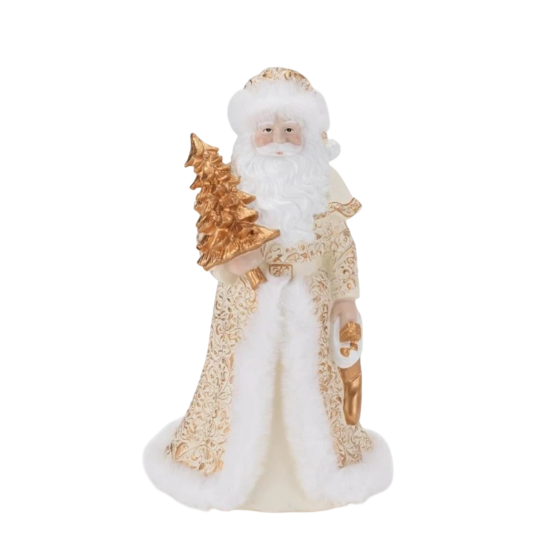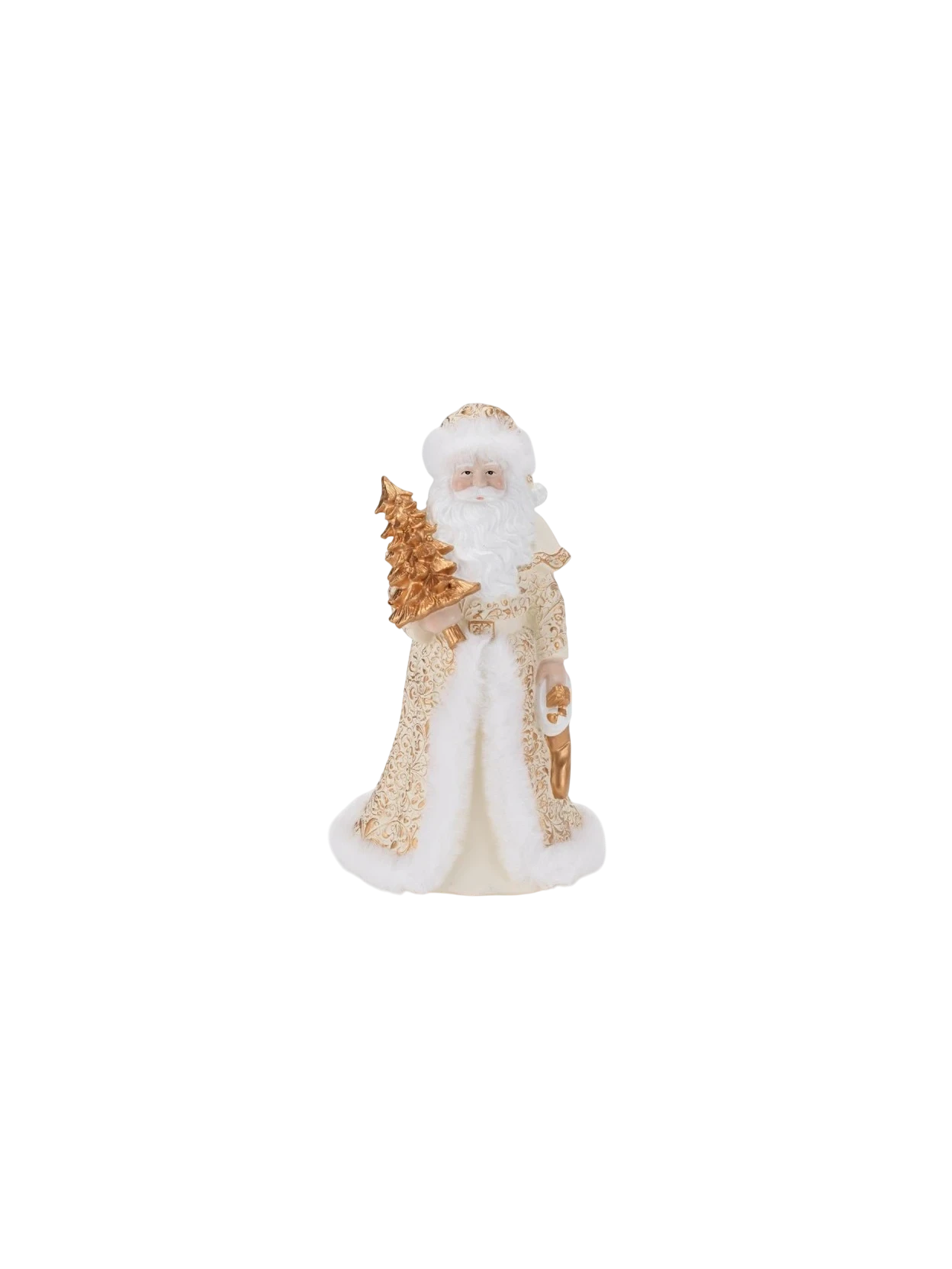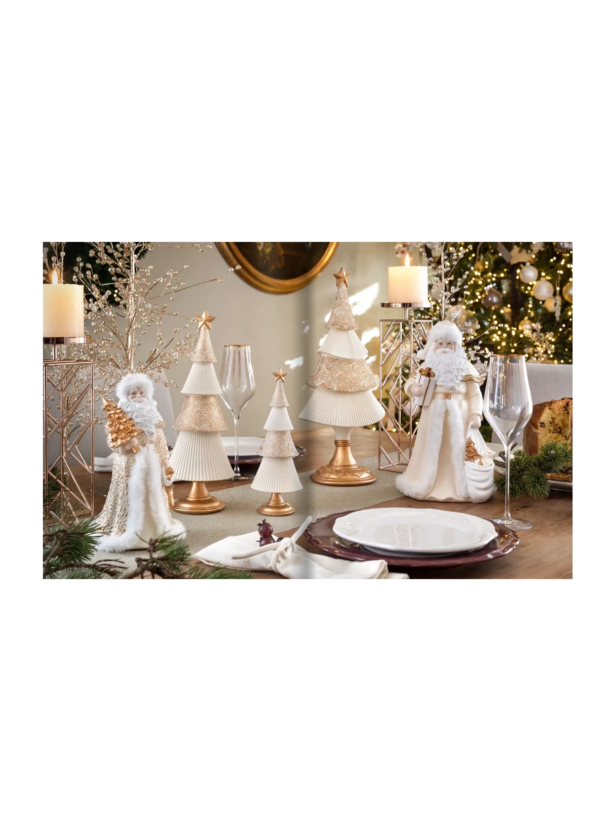 Bring a touch of sophistication to Christmas with Henriette's 23cm-tall Santa Claus, entirely hand-painted in white resin with gold details. This elegant reinterpretation of the classic Christmas symbol enhances any space, transforming tables, shelves, or display cases into sophisticated festive settings. Every detail speaks to the brand's masterful craftsmanship, for those who love a Christmas with a simple yet impactful style.