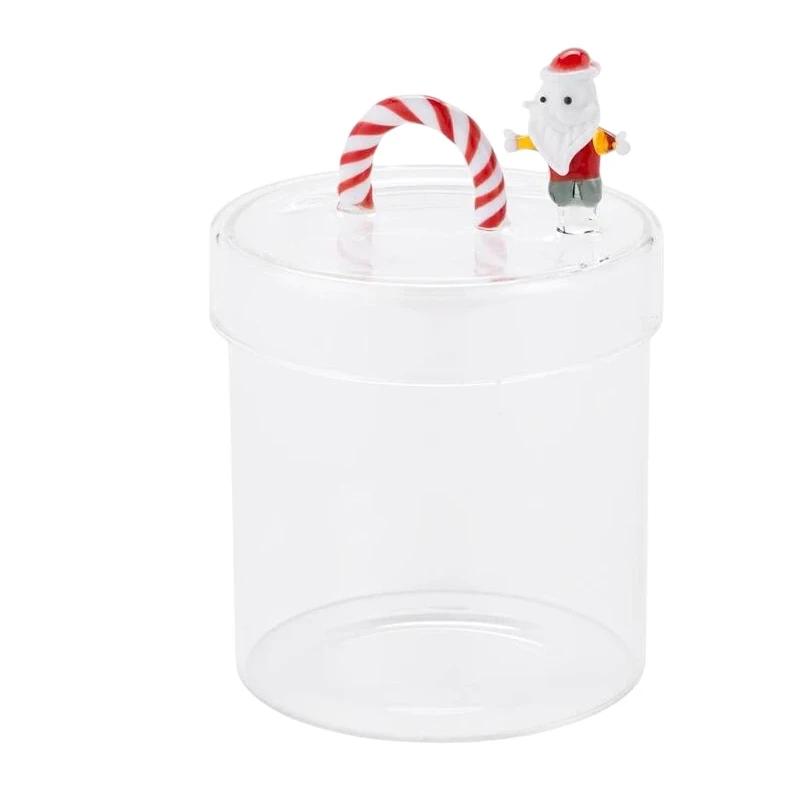Henriette's Clear Glass Jar with a Candy Cane Handle and Santa Claus on the Lid from the Treasure Collection is a creation that combines functionality and Christmas spirit. Crafted from clear glass, it allows you to admire the contents, while the lid decorated with a sweet Santa Claus brings a smile and spreads the joyous holiday atmosphere. The candy cane-shaped handle adds a fun and original detail, evoking the scents and colors of Christmas. Measuring 10 x 14 cm in diameter, this jar is ideal for holding sweets, cookies, or small decorative objects, making it a standout feature on laid tables, sideboards, or themed corners. The transparency of the glass pairs with the vibrant hues of the decorations, creating an elegant and luminous effect.
