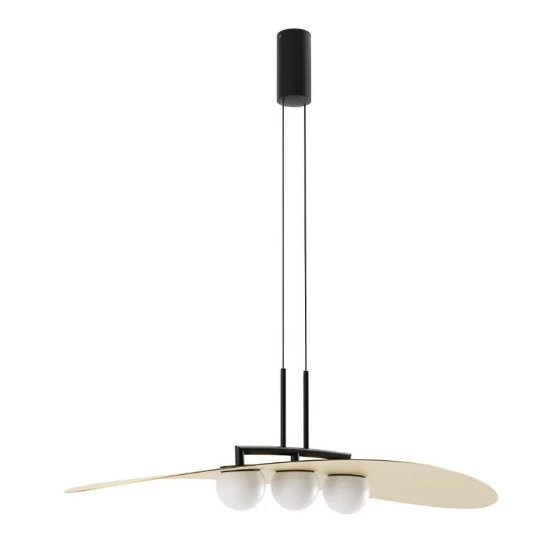 LED pendant lamp in metal with black and matt gold finish and 3 opal blown glass diffusers.