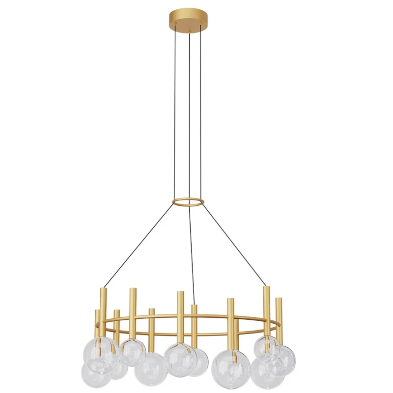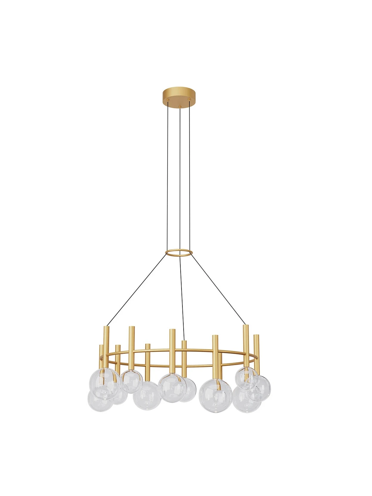 Bolla by Redo Group is a circular, gold-plated pendant lamp that perfectly combines contemporary design, premium materials, and advanced technology. Designed for interiors, it features a matte gold-painted metal and aluminum frame, paired with an elegant, transparent blown glass diffuser that casts a warm, even light. Equipped with twelve 4.4W CREE COB LEDs, for a total power of 53W, it delivers a luminous flux of up to 6,533 lumens with a selectable color temperature between 2700K and 3000K and a color rendering index (CRI ≥90) that enhances every nuance. The system is dimmable via Triac control, allowing you to adjust the light intensity to suit the desired atmosphere. With a 120° beam angle and high energy efficiency, the Bolla lamp guarantees reliable performance and superior light quality. Perfect for enhancing living rooms, dining rooms, or elegant contract spaces, the Bolla pendant lamp by Redo Group combines aesthetics and technology in a single design icon.