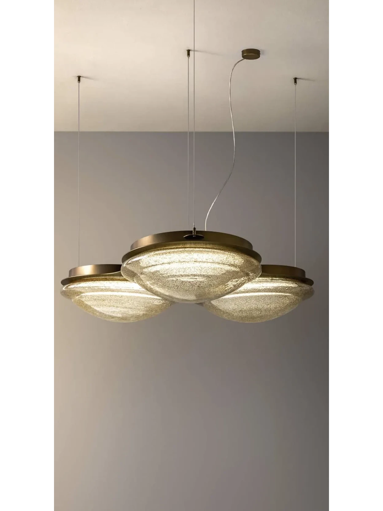 Baryon is the pendant lamp by Olev that combines material, light, and craftsmanship in a surprising balance. The hand-blown glass, embellished with a dense network of golden bubbles, creates a unique visual effect, transforming light into a warm and vibrant flow. The downward emission is intense and generous, yet the glass texture elegantly softens it, creating an enveloping and sophisticated atmosphere. The broad, rounded shapes lend a striking presence, ideal for spaces that want to stand out without sacrificing delicacy.