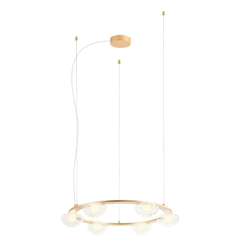 Sinclair Circolare is a refined pendant lamp, designed to enhance interiors with style and quality light. The matt gold painted metal structure supports Pyrex glass diffusers, transparent on the outside and satin-finished on the inside, available in versions with 6, 8, or 12 globes to adapt to different lighting needs. The range includes versions from 37.2W with 144 SMD 2835 LEDs, up to 74.4W with 288 SMD 2835 LEDs, reaching a brightness of up to 7791 lm and a CRI of 93. All versions are TRIAC dimmable and guarantee a uniform and enveloping warm 3000K light. With an IP21 rating, Sinclair Circolare combines elegance, versatility, and performance, making it perfect for living rooms, dining rooms, and designer spaces that require quality, adjustable light.