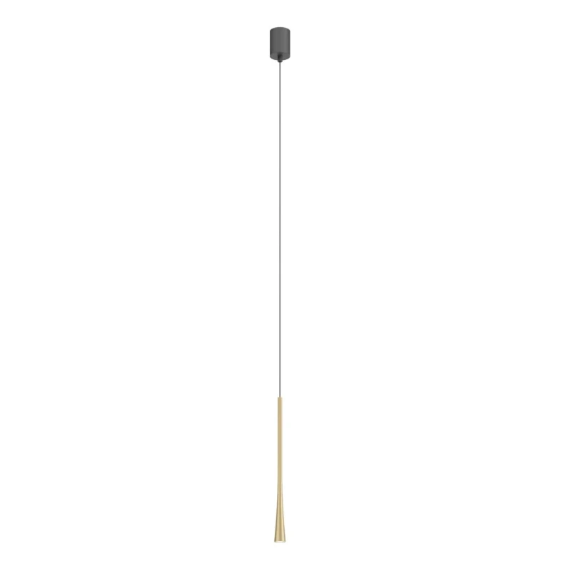 Ito by Redo Group is a designer pendant lamp designed for modern and minimalist interiors. It features a matte black ceiling rose and a matte gold-painted extruded aluminum body. Equipped with a 6.2W COB LED, it offers warm light (3000K or 2700K) with a 24° optic and a CRI of 90 for excellent color rendering. The transparent polycarbonate diffuser ensures precise light distribution. Not dimmable.