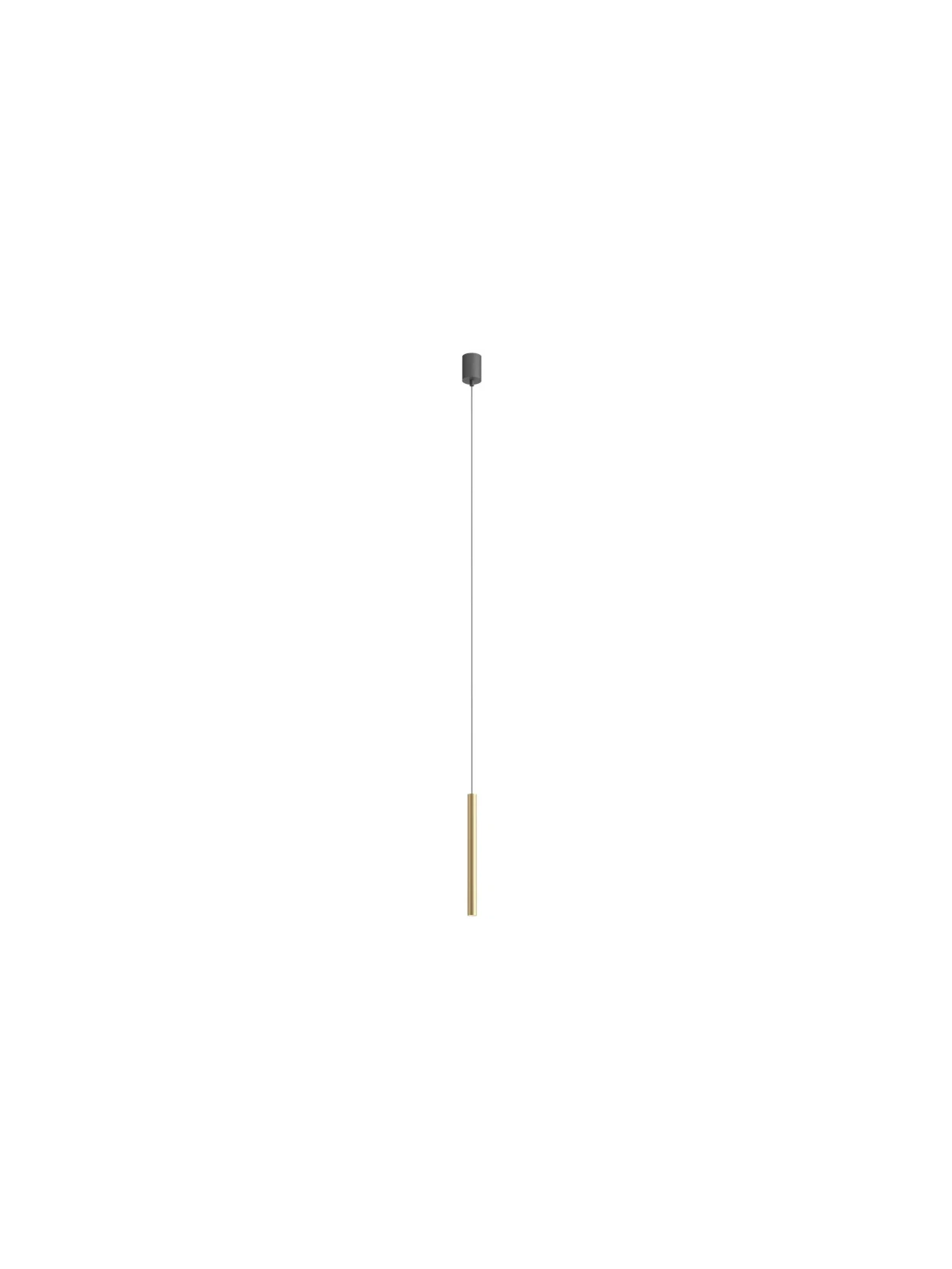 LED pendant lamp with a matt gold extruded aluminum frame. Transparent polycarbonate diffuser.