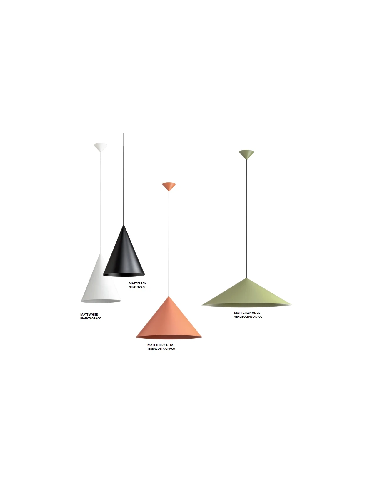 Pendant lamp with a conical structure in matte white painted aluminum. The diffuser and reflector are made of white painted aluminum.