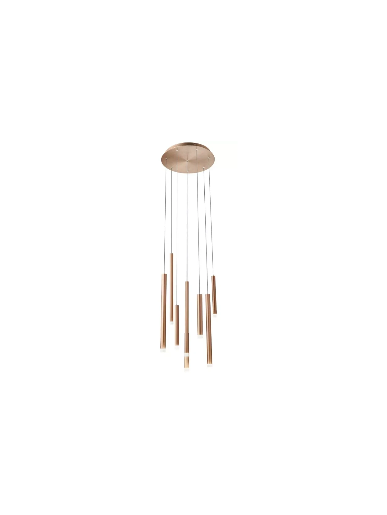 Madison by Redo Group is a multiple pendant lamp distinguished by its minimalist and elegant style. The frame is made of metal and brushed aluminum with a matte copper anodized finish, while the transparent acrylic diffusers enhance the purity of the light, making it ideal for modern and minimalist spaces. It is equipped with a 4W SMD 3030 LED that emits a warm 3000K light. The LED's luminous flux is 450 lumens, with an effective output of 272 lumens at fixture level. The lamp has a CRI of 80. It is not dimmable, operates on a voltage of 220–240V at 50/60Hz, and is certified in protection class I with an IP20 rating.