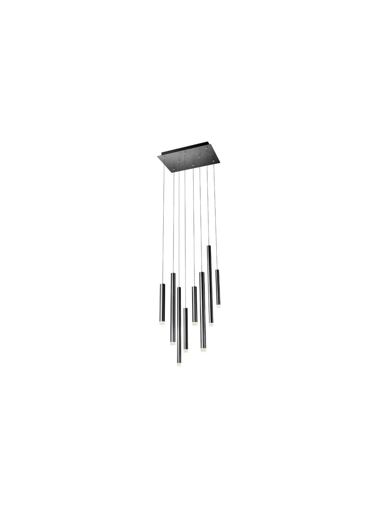 Multiple pendant lamp made of metal and brushed aluminum anodized matt black and transparent acrylic diffusers.