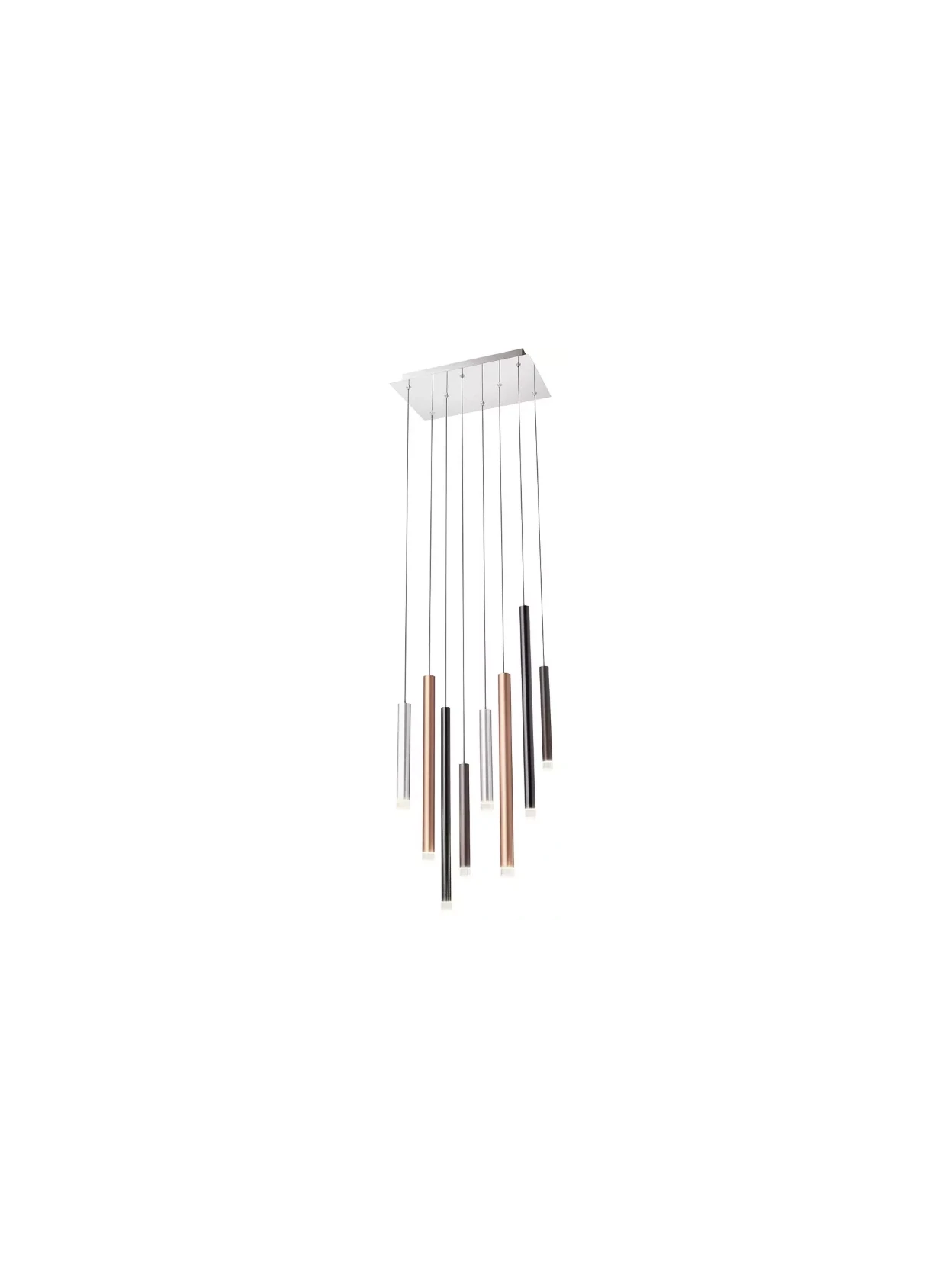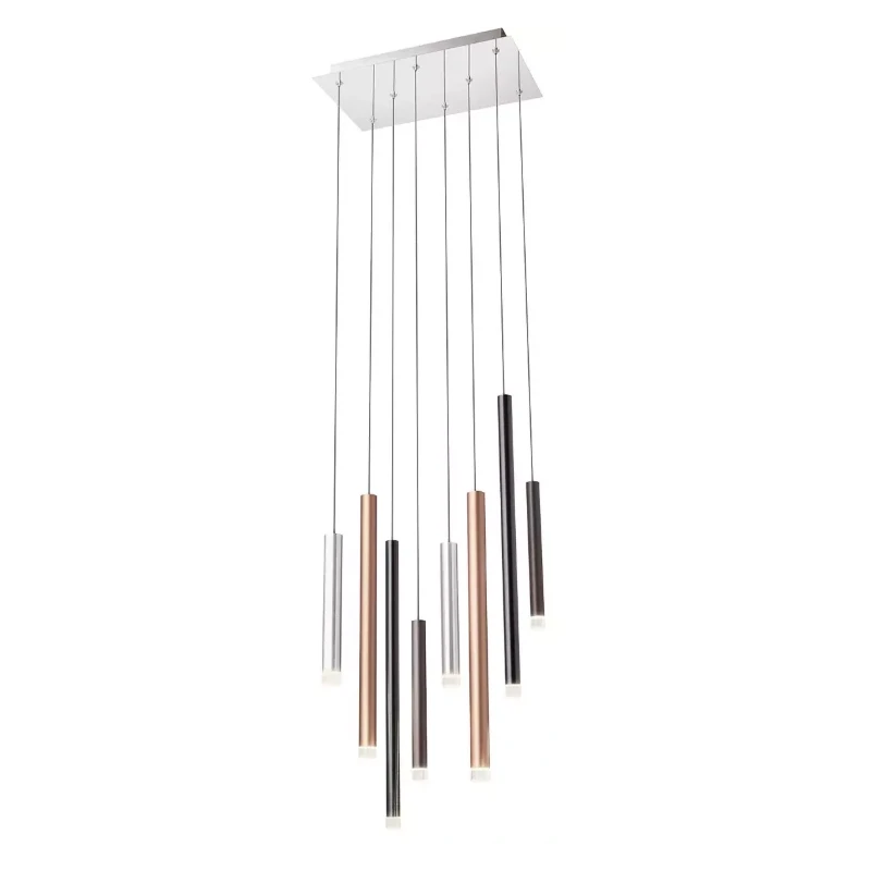 Multiple pendant lamp with silver-painted metal frame and chrome front base. Brushed anodized aluminum cylinders in matte copper, matte brown, and black. The diffusers are clear acrylic.