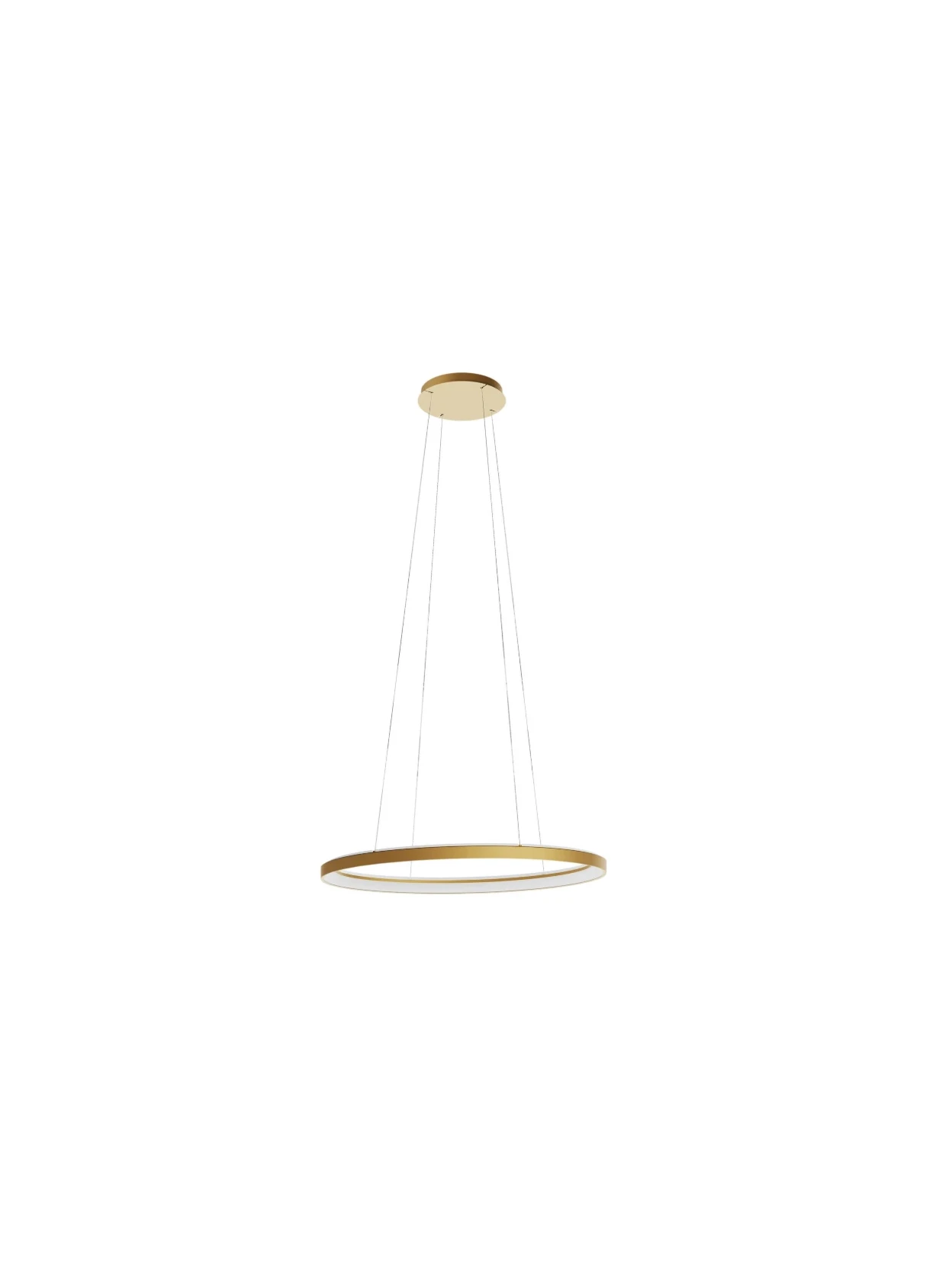 Nobu by Redo Group is a pendant lamp with a minimalist, modern design, featuring an aluminum and metal frame painted matte gold. It features highly efficient SMD LED technology, providing direct and indirect light, and allows for adjustable brightness (3-step dimmable) and color temperature, from warm white (3000K) to neutral white (4000K). The direct light diffuser is made of white opal acrylic, while the indirect light is controlled by a polystyrene layer, providing soft, uniform illumination. All models guarantee high color rendering (CRI 90), operate at 220–240V (50/60Hz), have an IP20 rating, and are classified as Class II.