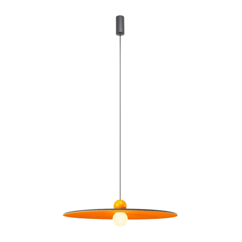 Pendant lamp with a matte black painted aluminum frame, a decorative sphere in matte orange painted aluminum, and a sound-absorbing felt shade in dark gray polyethylene terephthalate on the outside and orange on the inside. The diffuser is made of opal white blown glass.