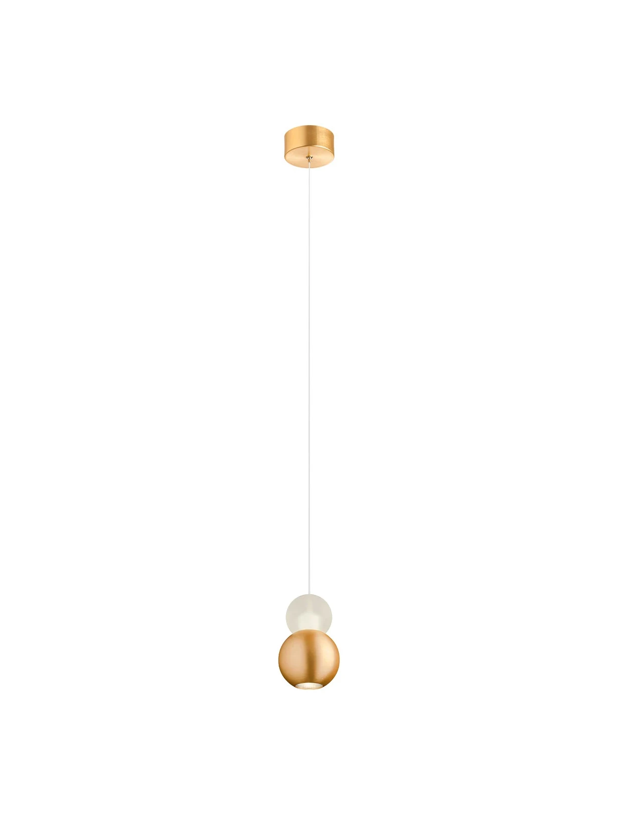 LED pendant lamp with direct and indirect light emission. Structure in aluminum and metal with gold anodized brass finish, diffusers in satin acrylic. Elegant and modern design for balanced lighting.