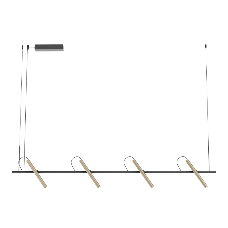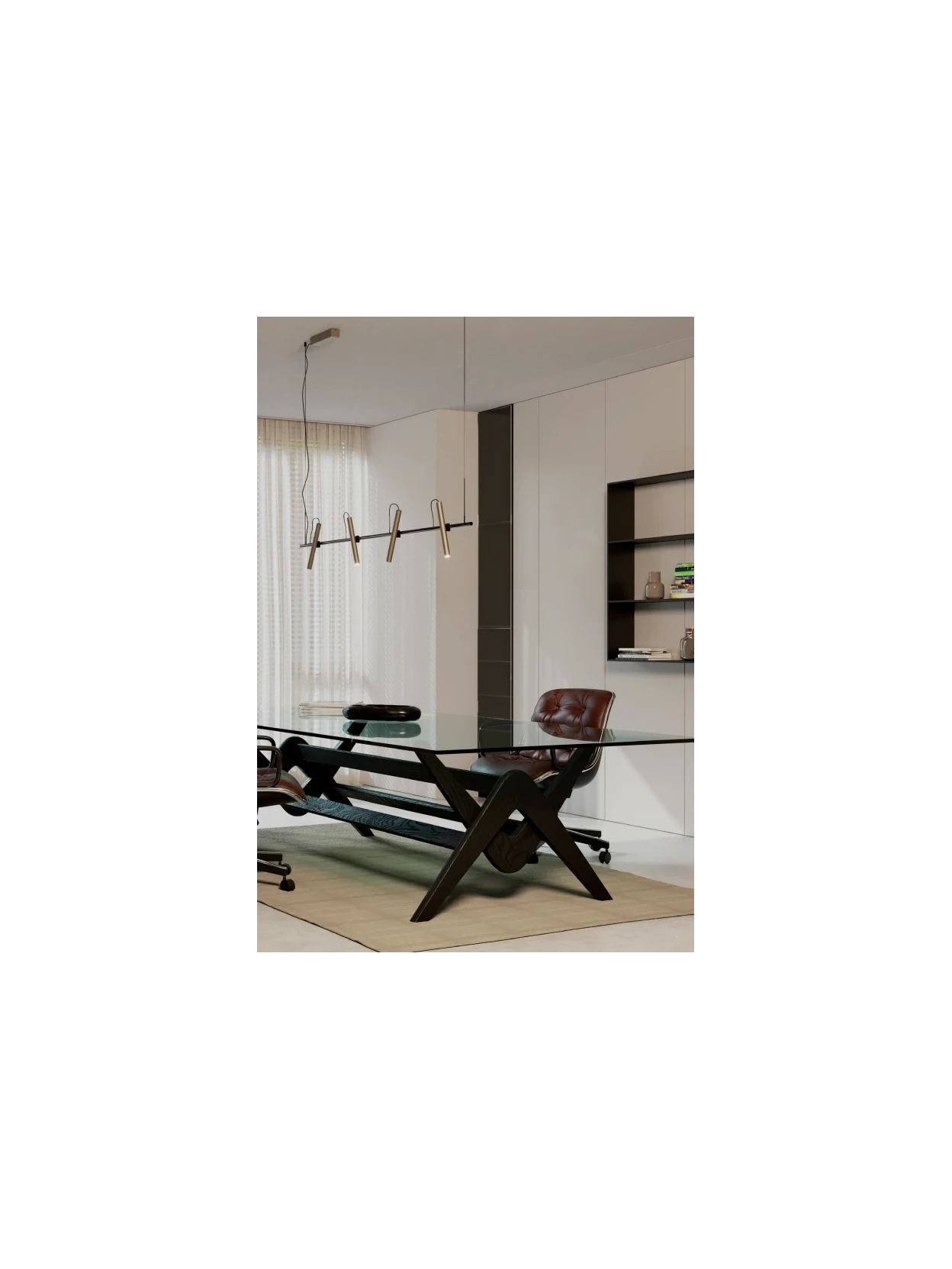 Praxi by Redo Group is a modern pendant lamp featuring four adjustable spotlights with integrated COB LEDs. The matte black painted aluminum and metal structure with silver coffee finish spotlight heads pairs with transparent polycarbonate diffusers for precise, atmospheric lighting. Available in warm 2700K or 3000K light, it offers effective light output and excellent light quality (CRI 90). TRIAC dimmable, it's perfect for residential and professional settings.