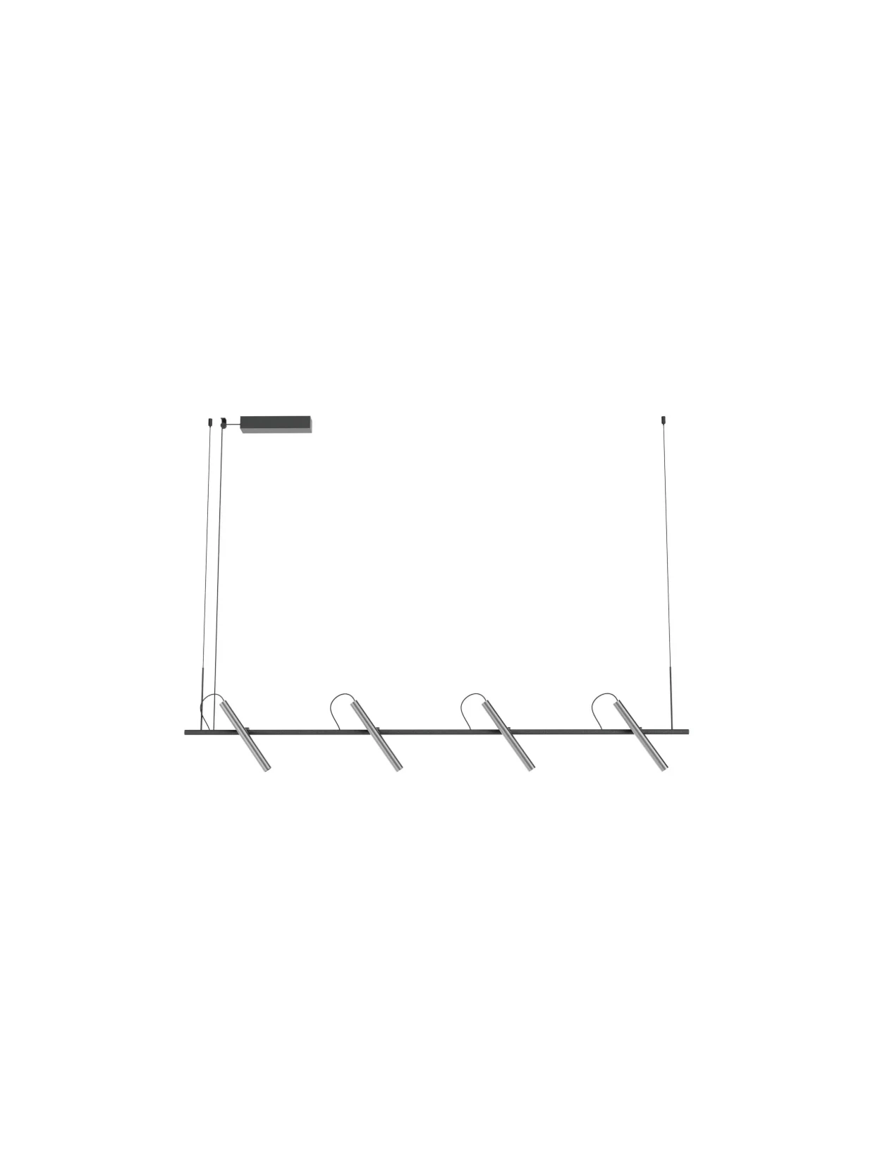 Pendant lamp with adjustable COB LED spotlights. The structure is made of extruded aluminum and matte black painted metal with foggy nickel spotlight heads and transparent polycarbonate diffusers.