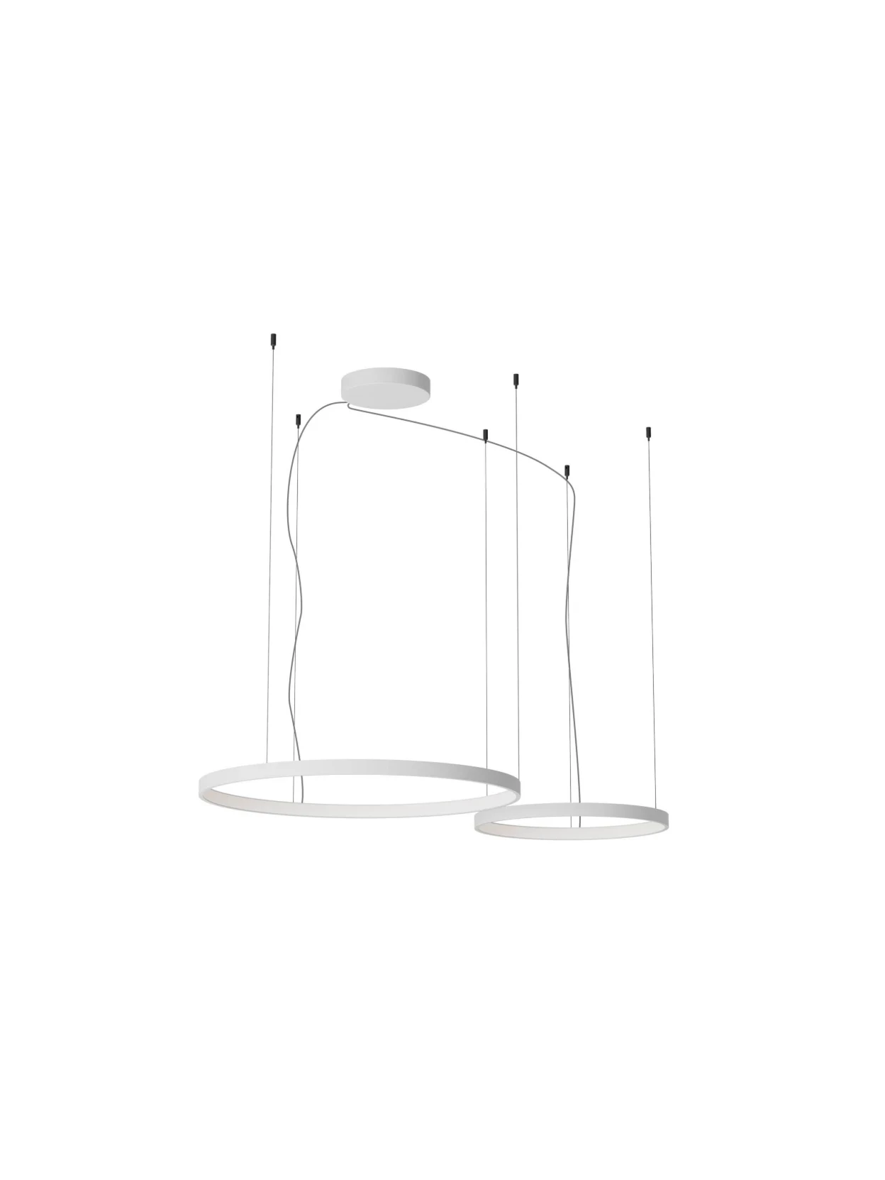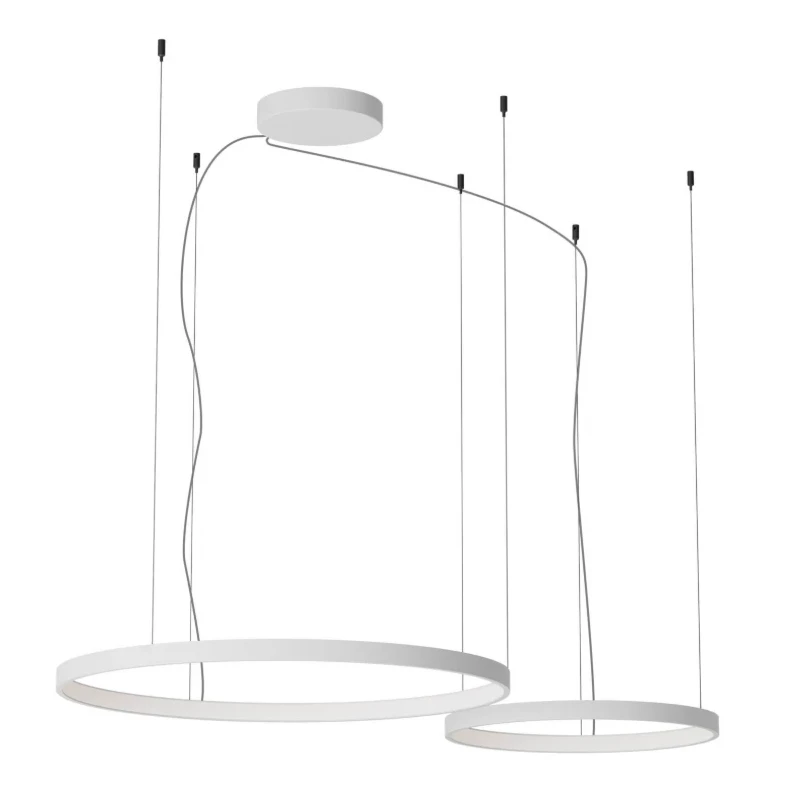 Pendant lamp with dimmable SMD LEDs and adjustable color temperature from warm white to neutral white. The structure is composed of two or three circles made of aluminum and matte white painted metal and white opal silicone diffusers.