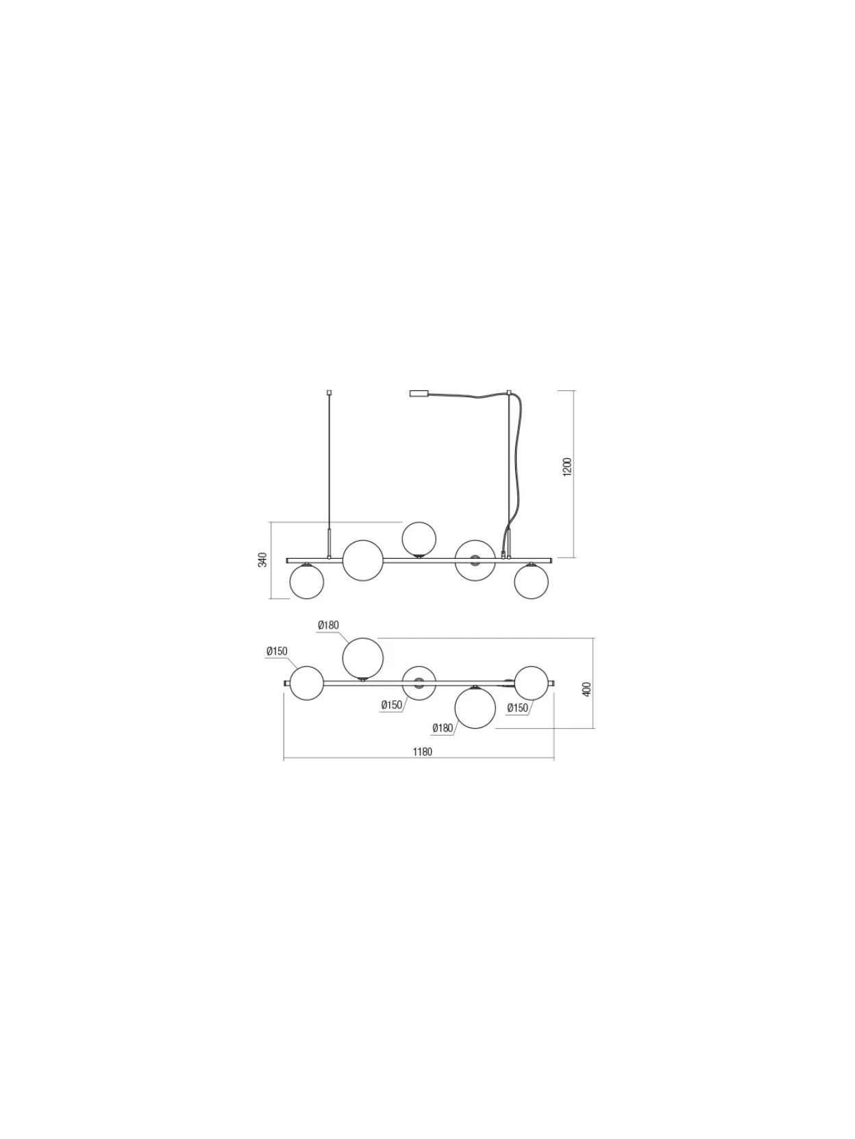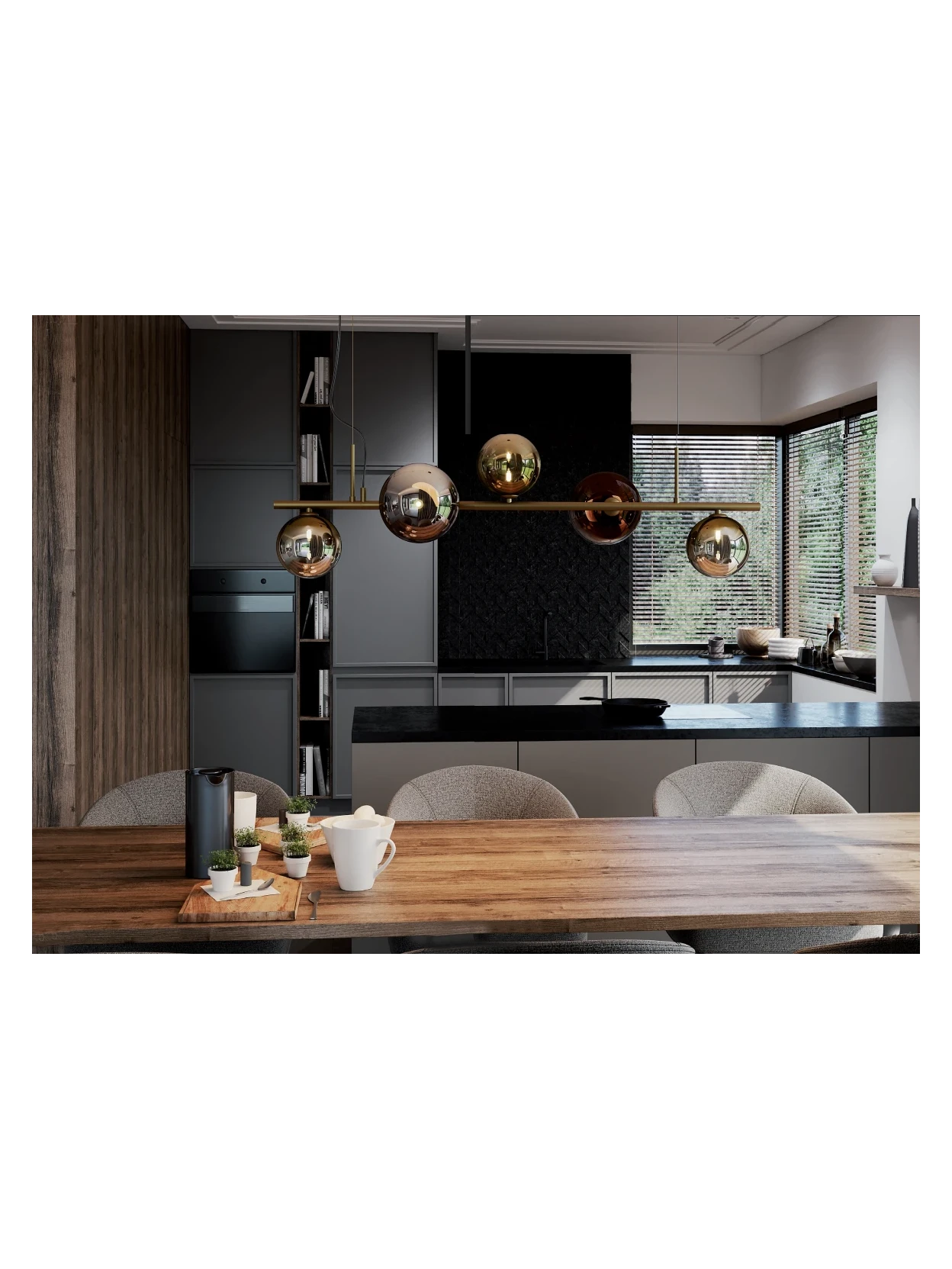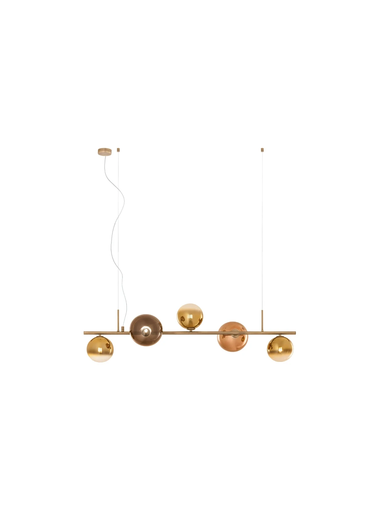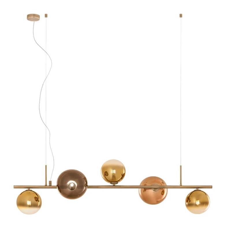 Roy by Redo Group is a linear pendant lamp with a refined and contemporary feel. The structure is made of metal with a matte antique brass finish. The five Pyrex glass diffusers, with gold and coffee mirrored shades, create captivating reflections of warm light, ideal for elegant and welcoming spaces. Compatible with G9 sockets up to 5 x 10W, power supply 220-240V – 50/60Hz. Protection class I, IP20.