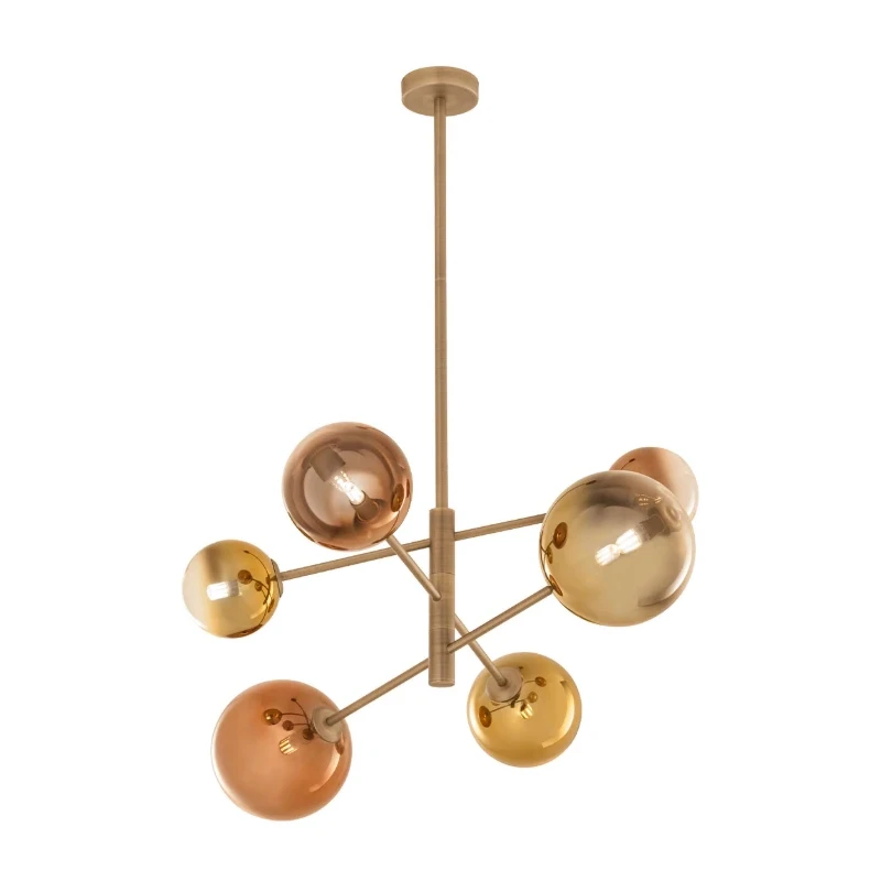 Pendant lamp with metal structure in matt antique brass finish and Pyrex glass diffusers in gold and coffee mirror finish.