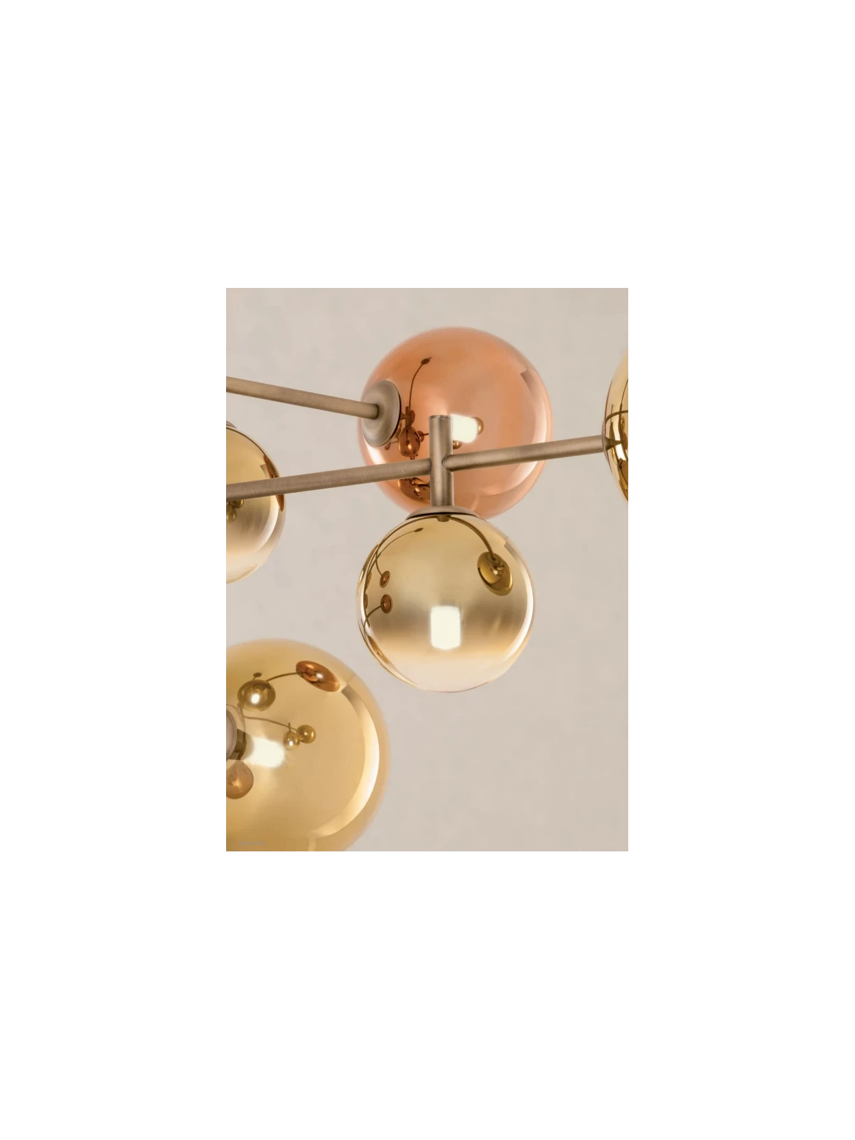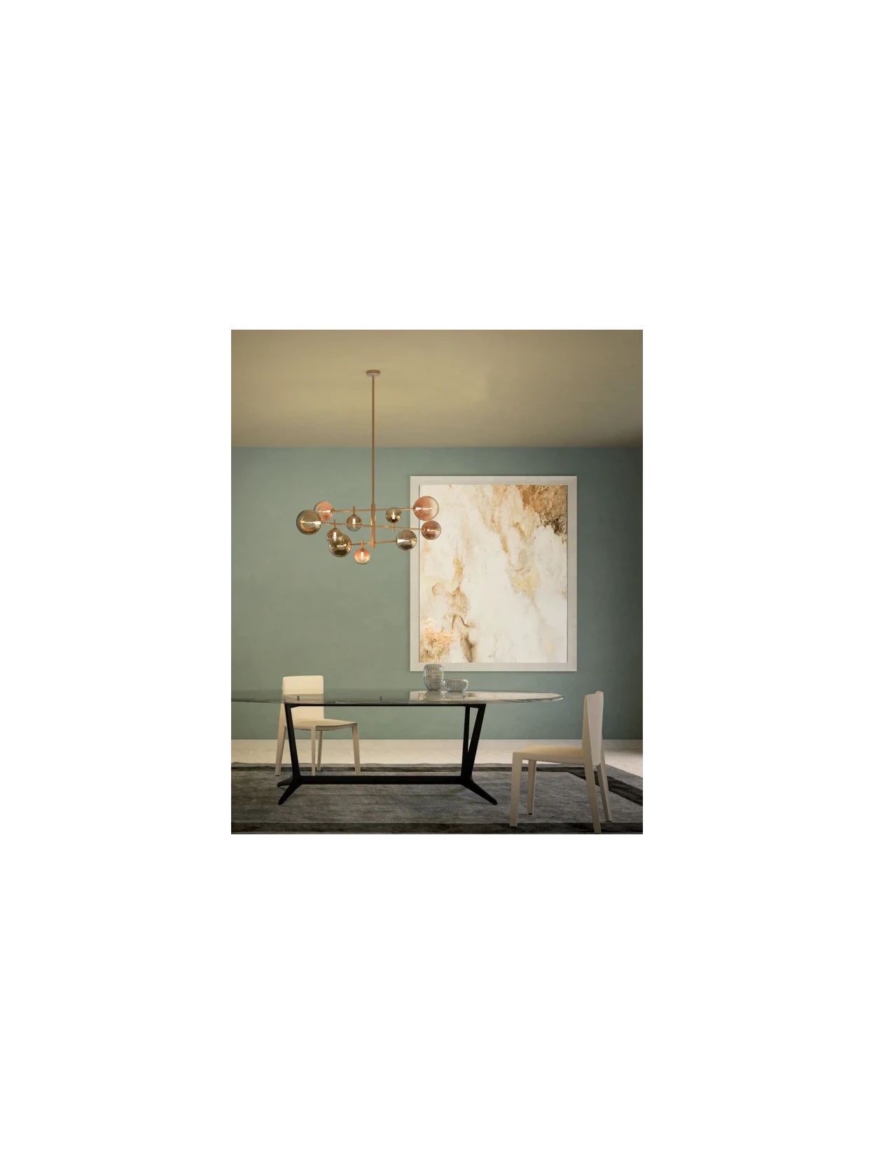 Roy by Redo Group is a pendant lamp with a dramatic and sophisticated design, perfect for enhancing elegant and modern spaces. The metal frame with a matte antique brass finish supports refined Pyrex glass diffusers with a gold and coffee-colored mirror finish, which cast a warm, enveloping light. Both versions operate at 220–240V (50/60Hz), with protection class I and IP20 rating. Ideal for large spaces requiring a touch of style and personality.