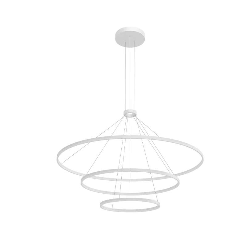 Orbit by Redo Group is a LED pendant lamp with a minimalist, modern design, featuring a matte white painted aluminum and metal frame and satin acrylic diffusers. Available in various sizes, it is perfect for interiors thanks to its uniform, intense light. Equipped with SMD LEDs, it offers true light output at a color temperature of 3000K (warm light) or 4000K (natural light). Dimmable with TRIAC technology, it has good color rendering (CRI 80) and is ideal for living rooms, meeting rooms, or commercial spaces with a clean, sophisticated style.