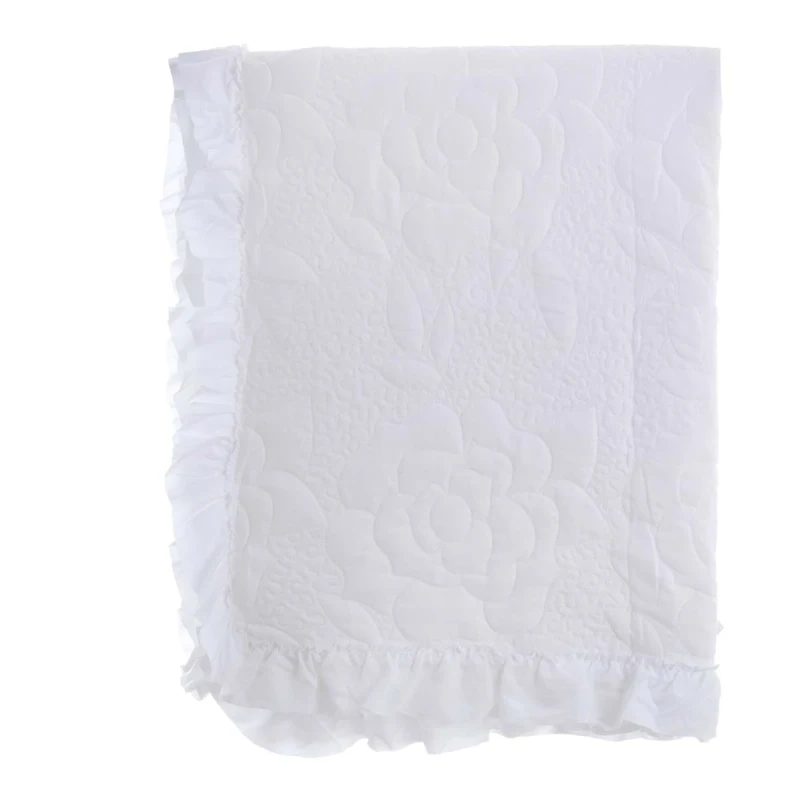 The Blanc Mariclò ruffled quilt from the Camelia collection combines elegance and comfort in a perfect balance of shabby chic style. Crafted from soft white fabric with a delicate tone-on-tone camellia motif in relief, it gives the bedroom a bright and romantic atmosphere. The 120 gsm filling ensures light and enveloping warmth, ideal for spring and autumn or for those who love a light night's sleep. Finished with a refined ruffled edge, it is a stylish furnishing accessory that enhances any room.