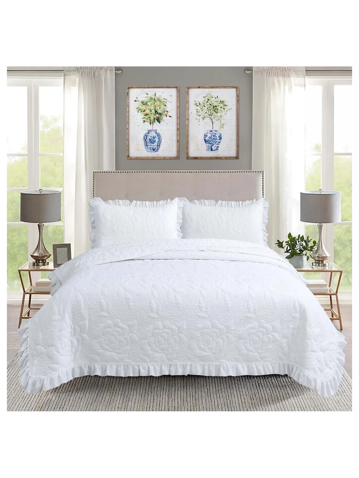 Quilt with ruffles by Blanc Mariclò from the Camelia Collection. Elegant and romantic, in soft white polyester with tone-on-tone embossed camellias, perfect for a refined shabby chic style.
