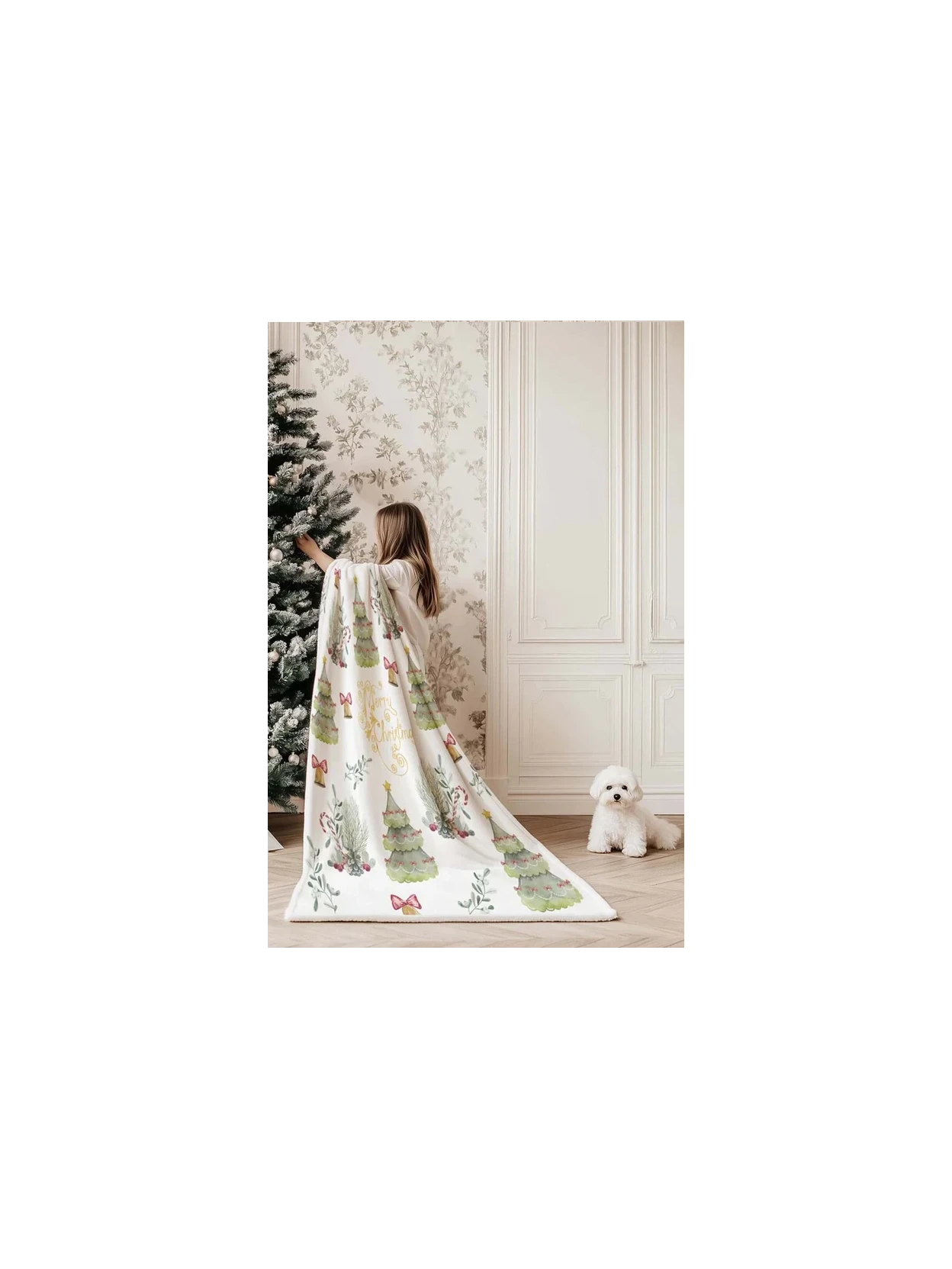 This 140x170cm Sherpa Christmas throw is made of 100% polyester (420 gsm). This soft throw features a cream background decorated with Christmas trees, the slogan "Merry Christmas," and holiday motifs. Soft and warm thanks to the Sherpa backing, it's perfect for the holidays.