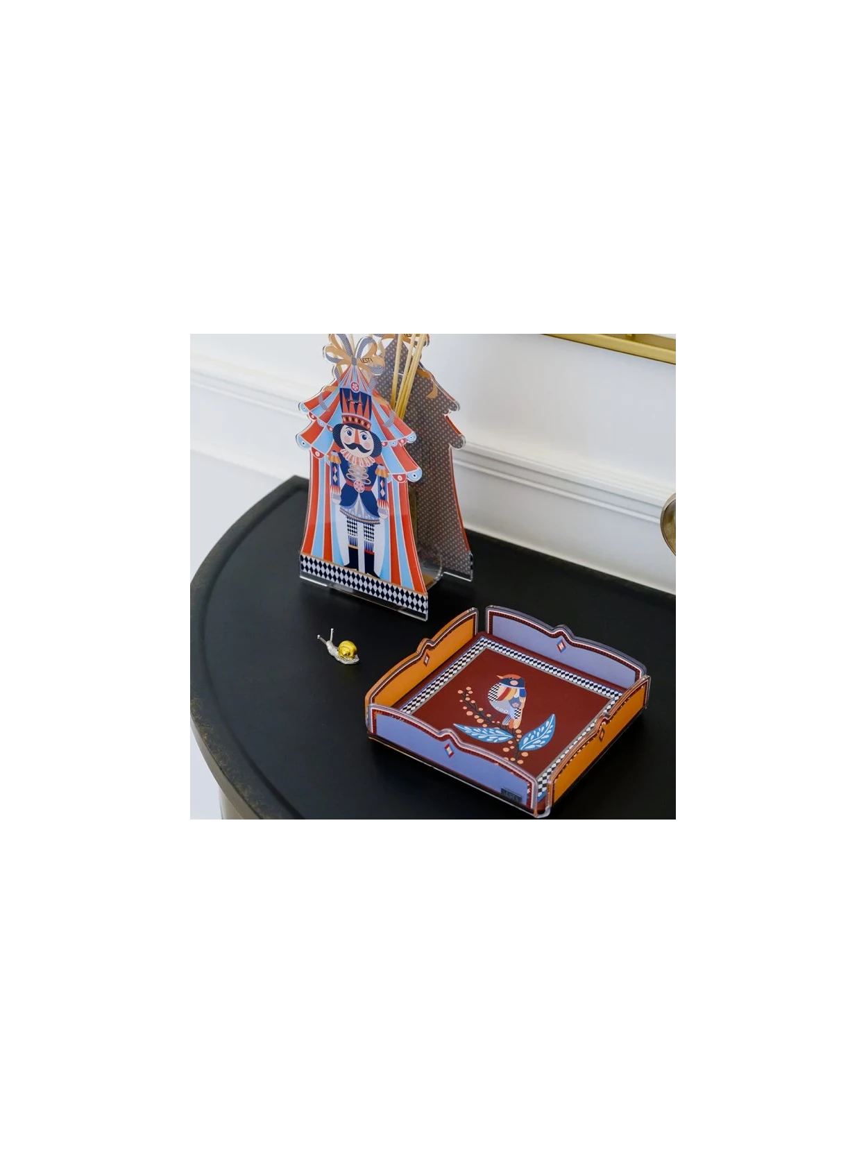 The Sogno collection is available in two versions, Gufo (Owl) and Uccellino (Bird), both featuring cheerful and refined decorations, ideal for adding a touch of personality and color to any space. This coin tray is a perfect choice not only for everyday use but also as an original and functional gift idea, designed for those who appreciate beautiful yet useful objects. The acrylic edges are an extraordinary material that guarantees brightness, transparency, and durability. It's more transparent than glass, yet weighs half as much and is shatterproof, up to fifteen times more resistant to impact. It maintains sharp, distortion-free images and is weather-resistant and can withstand high temperatures up to 85°C. It is also fully recyclable, a conscious and sustainable choice for those seeking a quality, environmentally friendly product.