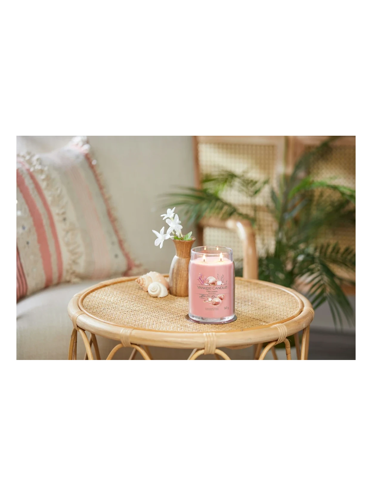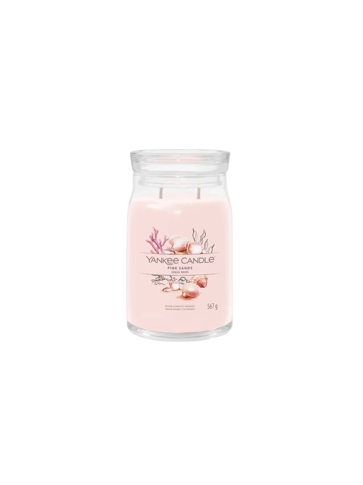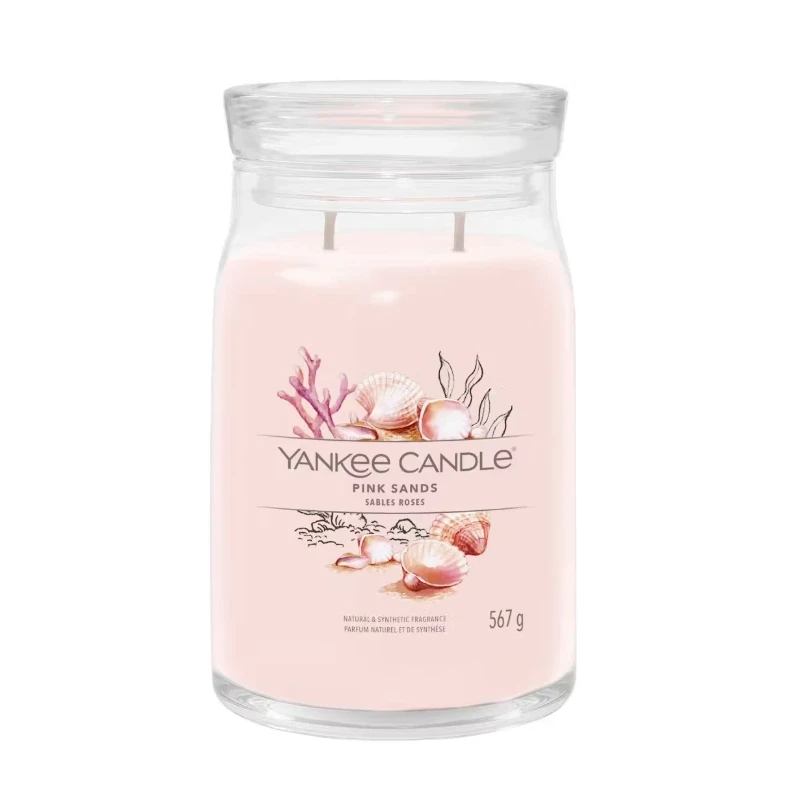 Yankee Candle's Pink Sands is a large jar candle that transports the senses to a dreamy escape to an exotic island, where the scent of freshness, sweetness, and warmth fills the air. Top notes of vibrant citrus, juicy melon, and sunny berries create a bright and joyful opening, like a sea breeze awakening the senses. At the heart, a refined touch of osmanthus adds floral delicacy and a soothing elegance. The base envelops with the warm sweetness of spicy vanilla, soft musk, and subtle woody nuances, leaving a relaxing and sensual trail. Pink Sands is a floral fragrance that evokes the pleasures of a tropical vacation, perfect for those who want to bring an atmosphere of relaxation, sun, and freedom into their home.